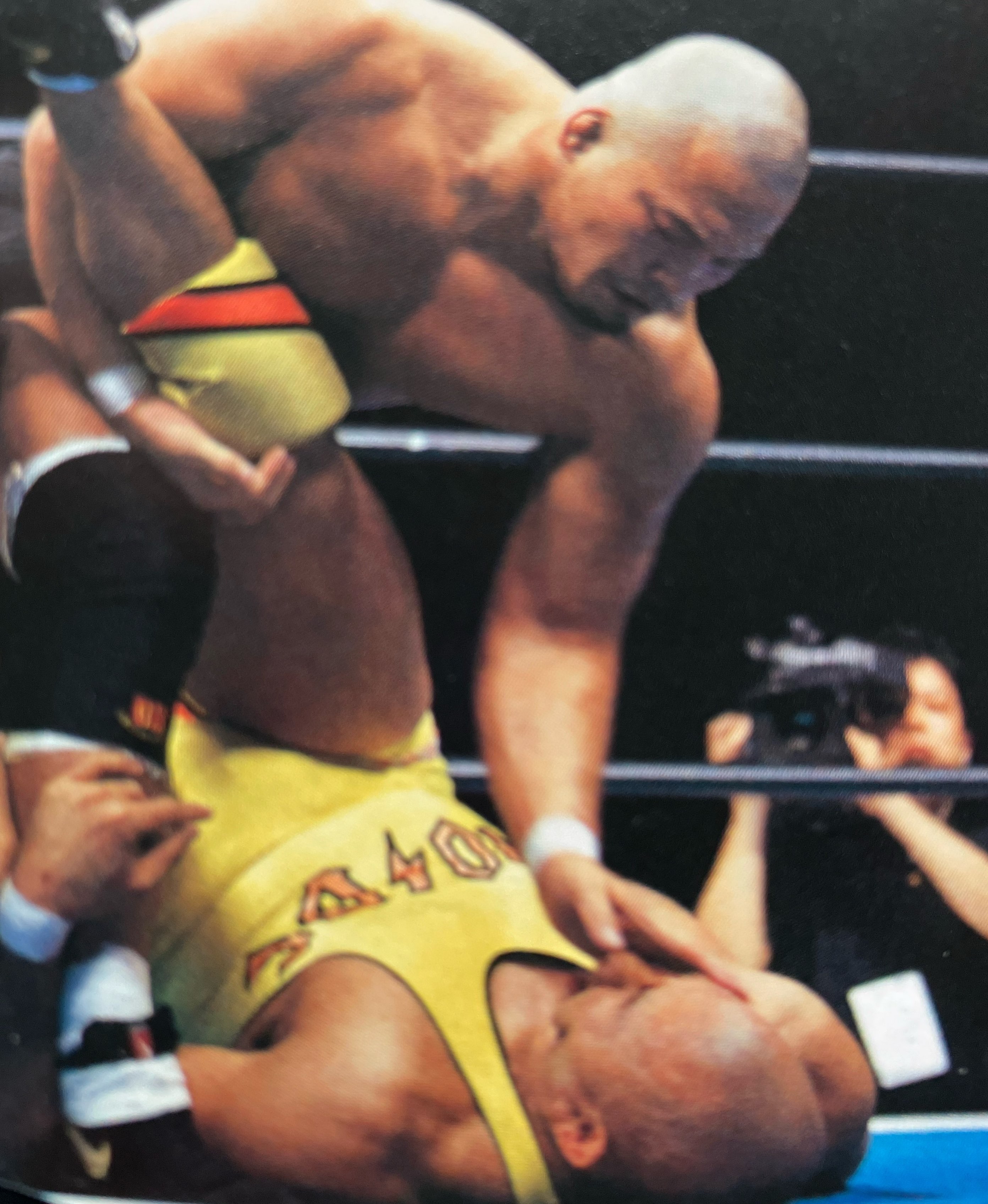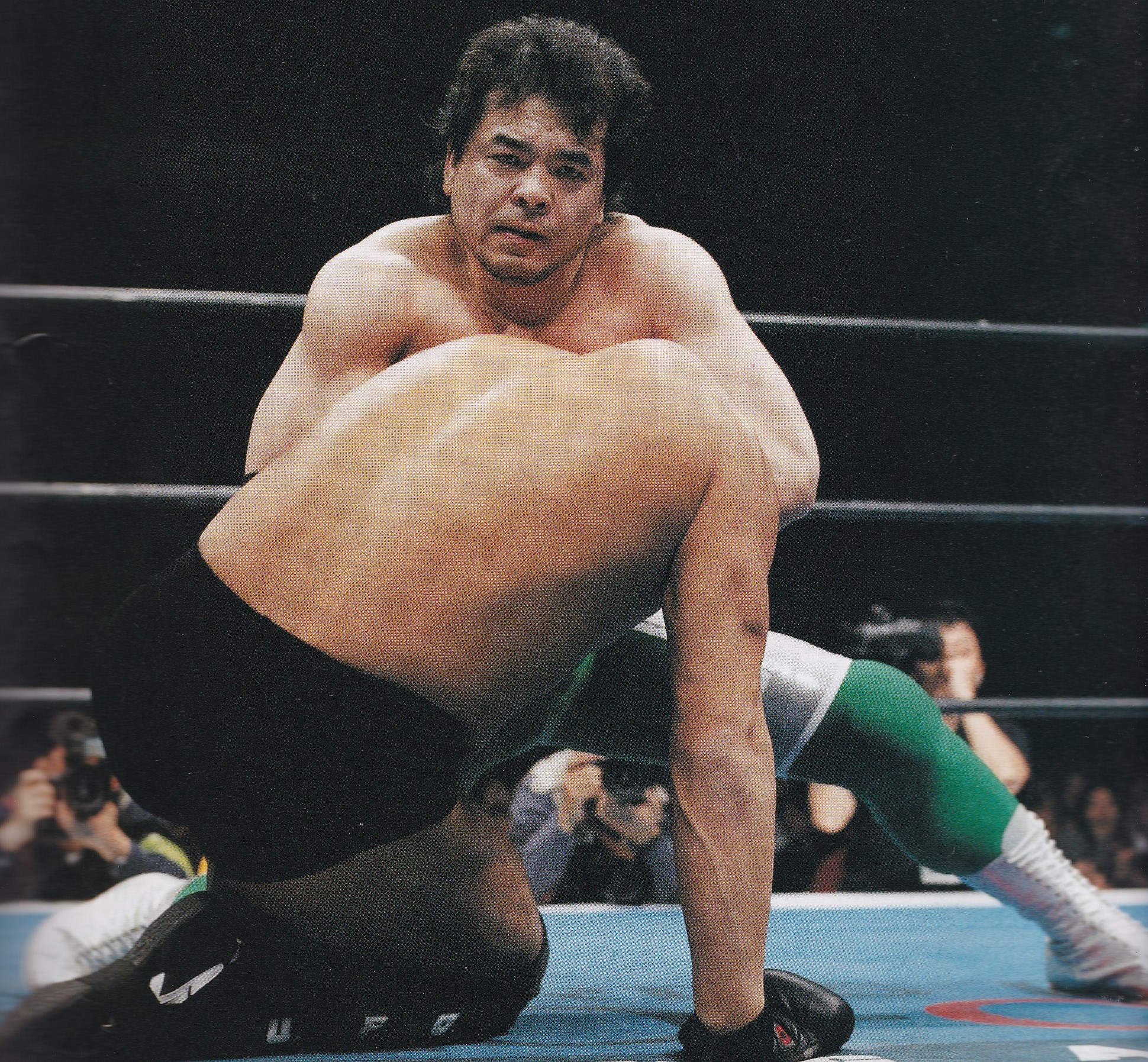 その後も村上は顔面にジャブを放つも、相撲の張り手を受けている力皇は平然と受けきり村上を挑発、逆に突っ張りに連打で押し返し、がぶってから自軍に押し込んで三沢に交代する。