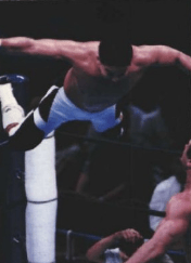 ルードは再びパイルドライバーで蝶野を突き刺すと、コーナーからのダイビングダブルニーを投下、これで勝負あったかに見えたが、タイガー服部レフェリーがルードの女性マネージャーとしてセコンドに着いていたメドゥーサに気を取られ、カウントに入るのが若干遅れてしまい、蝶野はカウント2でキックアウトし九死に一生を得る。