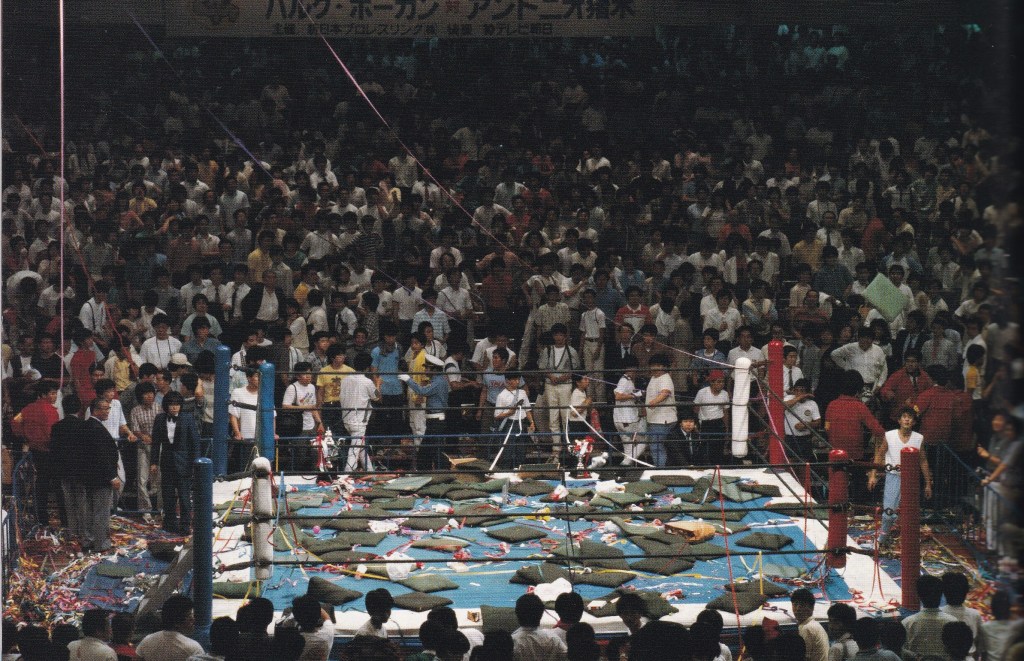 猪木のリベンジの場がこういう結末になったのか…、ホーガンへのリベンジこそ、猪木の望んだ展開であり、新日本的にも全ての不安を払拭するためには猪木には勝ってもらわなければいかず、館内もその空気で充満していた。だが全米の大スターへとのし上がっていったホーガンも負けられない立場になってしまっていた。引き分けではファンが納得せず、ファンの空気に押される形で2度に渡る延長戦となったが、それでも出口が見えなくなったかのように落としどころが見つからない状態となり、長州の乱入で全てを済ませようとしていたのか…だが1度目の裏切りはファンは許しても2度目はさすがに許さなかった。ファンが臨んだのは猪木がキチンとした形でのリベンジだったが、不透明な形での猪木の勝利は誰も望んでいなかった。それがファンの怒りに繋がり暴動に発展したのではないだろうか…