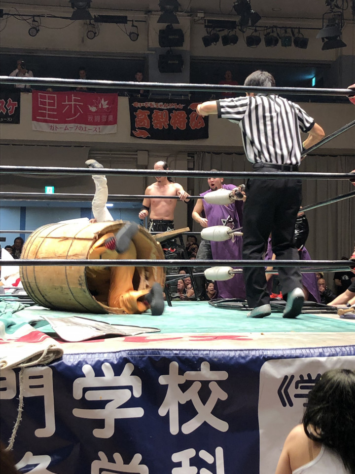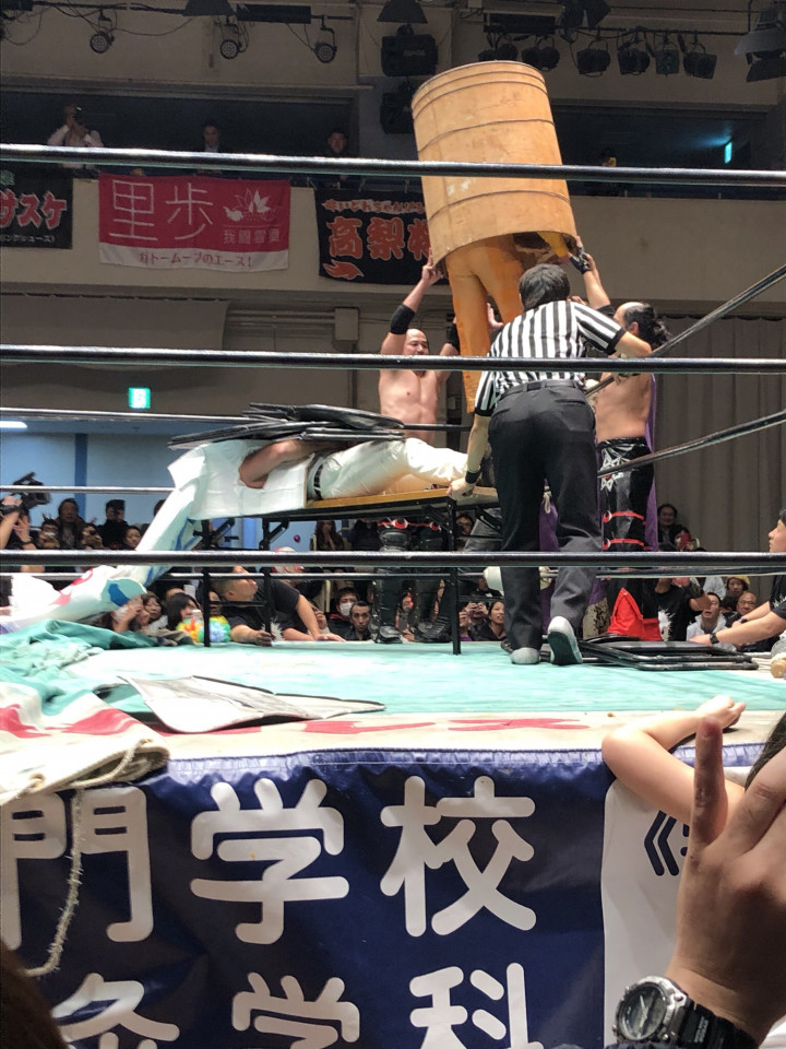 バラモンはラダーを投げつけて髭女らを排除すると、ミサイルを破壊しながらLGBTaroをテーブルにセット、コーナーのマスターに割れてボロボロになった和桶を被せて背面落としこと高輪ゲートウェイで3カウントを奪い。49分に渡る激戦を制した。