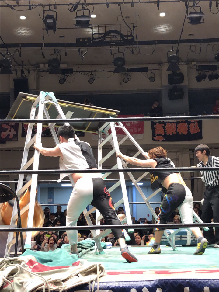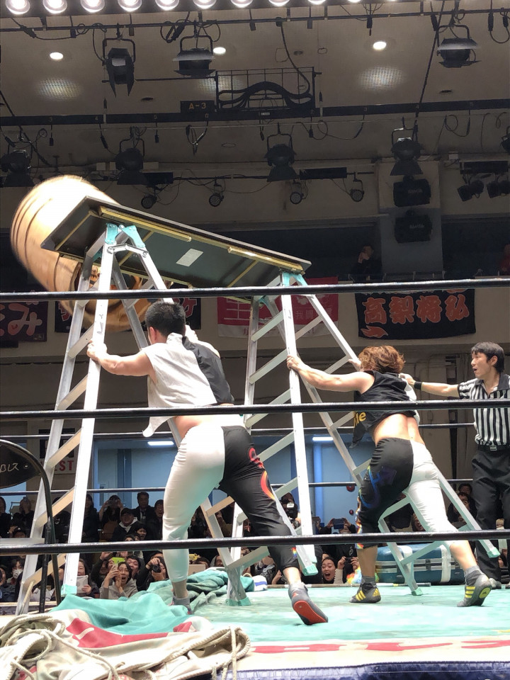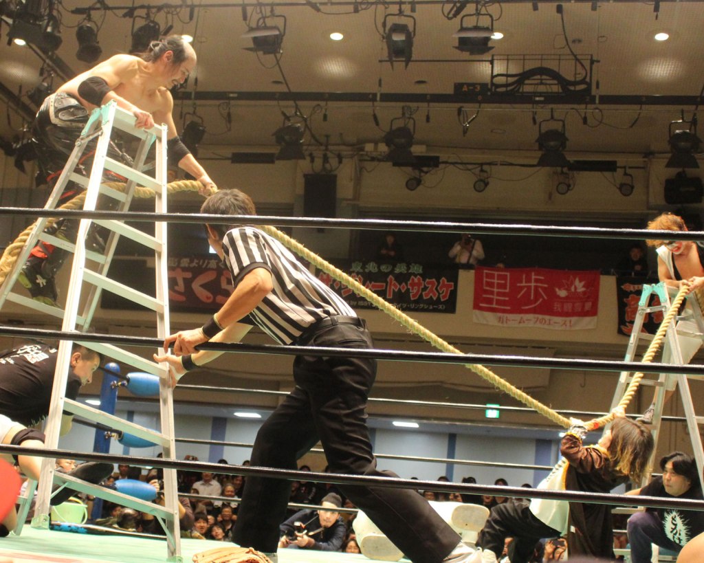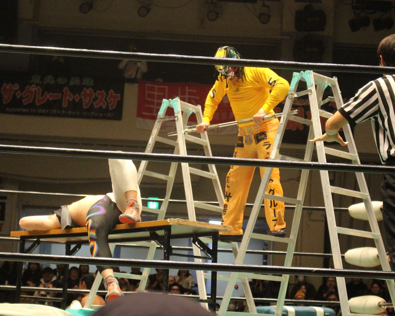 そこでマスターがラダー二脚をセット、1号2号をその上に寝かせてコーナーからダイブを狙うが1号2号がパワーボムで叩きつけ阻止、マスターは大ダメージを負うが、カバーはバラモンがまたどこかから持って来たオットセイを投げてカット。そして対角線上にラダーがセットされると、その上に乗ったバラモンと2号が綱引きを開始するが、プリティがなぜか綱渡りを狙うと、ラダーが倒れて失敗してしまう。