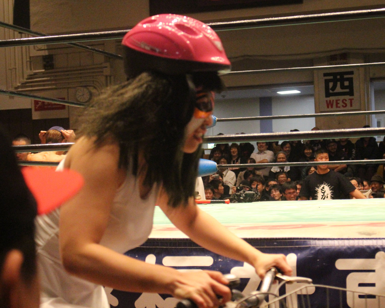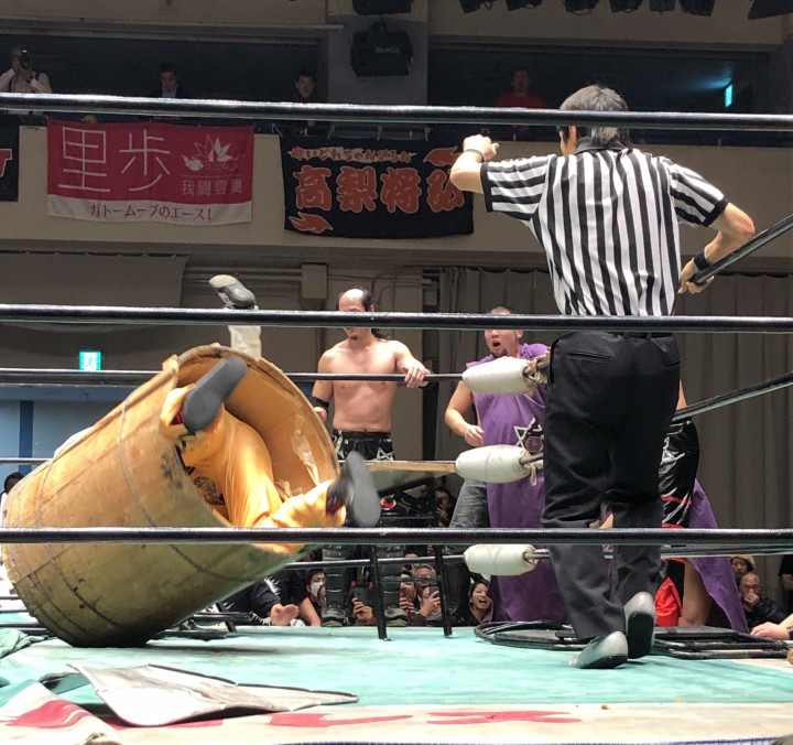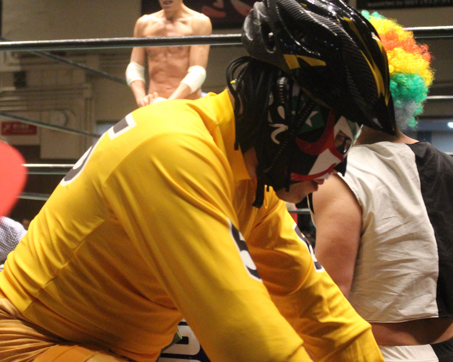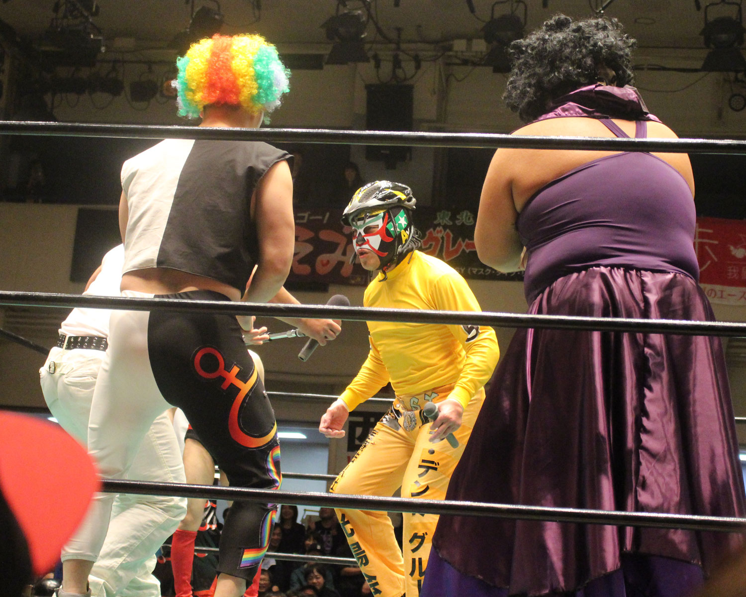 LGBTaroがバラモンをマイクスタンドにして歌えば、バラモンと1号、2号は合わせ鏡のように同じ動きをして相打ち、松野は3号を髪を引きずるなど痛めつけて館内からDVコールが出るも、3号も逆DVで反撃する、プリティはロビンのマスクを剥ぐなどリング内での攻防をよそに、マスターはひたすらリングの周りを自転車で走り回る。