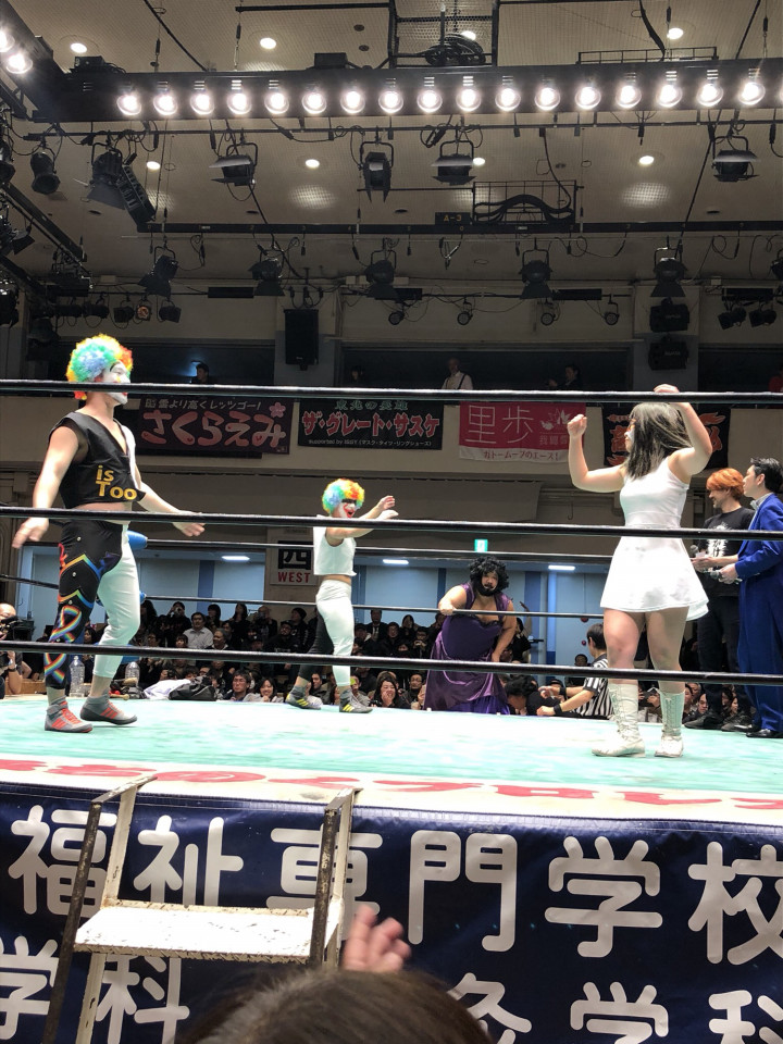 ○グレック・グロリアス 里歩 駿河メイ(11分26秒 エビ固め)さくらえみ 高梨将弘 ×バリアン・アッキ