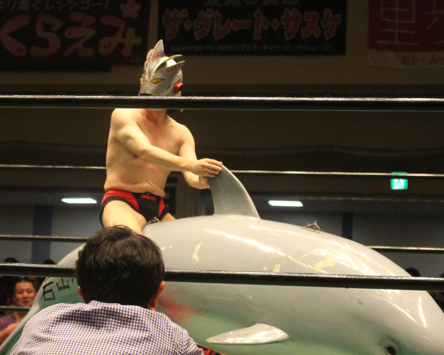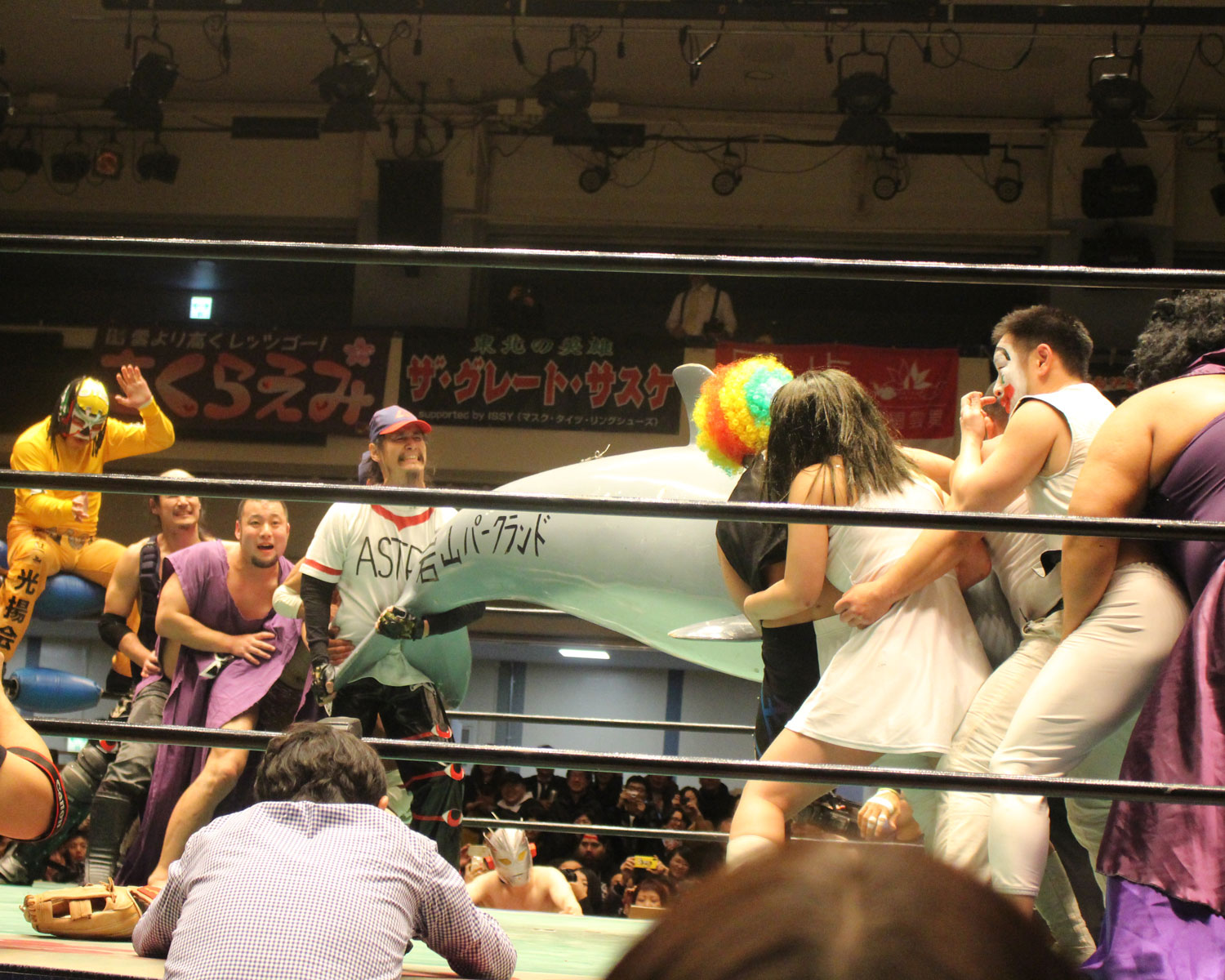 ここでセコンドの忍と関根龍一がイルカのなごり雪を投入。ロビンはイルカに乗った少年になりたかったのか、なごり雪に乗るがバラモンから蹴られてしまい、両軍でなごり雪を挟んで押し合いになるが、どこからか持って来たのか、リスの置物もなごり雪の上にセットされ、マスターもプリティをキックボードに乗せて直撃させ、そこでマスターがコーナーから気を浴びせようとするが、反対側のコーナーではプリティが気を狙おうとするが、マスターはデッドリードライブで阻止する。