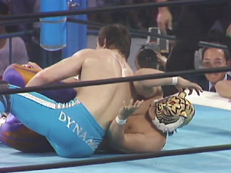 これを逃さなかったキッドはニードロップからコーナーに叩きつけ、カナディアンバックブリーカーは汗で滑って失敗も、キッドはエルボードロップを投下、スリーパーからヘッドシザースへと移行し絞めあげるが、逃れたタイガーはリバースインディアンデスロックで切り返し、弓矢固めへと移行する。