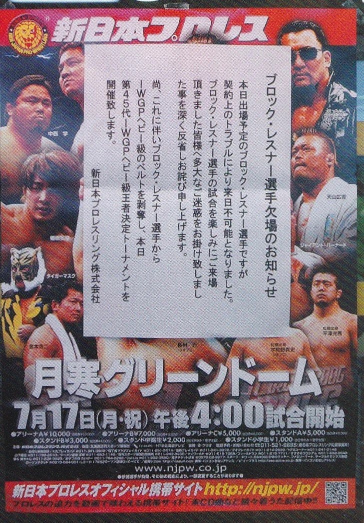 2006年7月17日、月寒グリーンドーム大会で行われる予定だったIWGPヘビー級選手権が王者のブロック・レスナーがドタキャンする事態が起き、また藤波辰爾も辞表提出、西村修と田中秀和リングアナが設立した無我ワールドプロレスリングに参加、ユークスの経営再建に反発する猪木が格闘技イベント「イノキゲノム」を推進するなど、ユークス体制になっても新日本プロレスはまだまだ混乱続きだった。