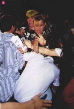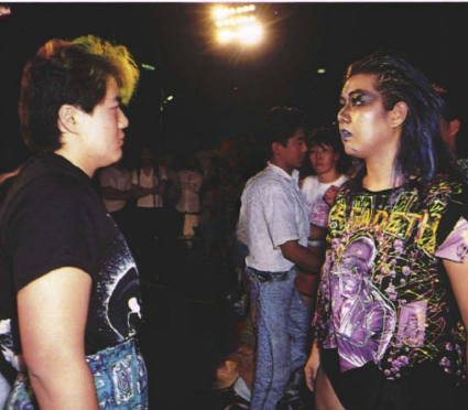 1992年7月15日 全日本女子プロレス大田区体育館、WWWAタッグ選手権(王者)山田敏代 豊田真奈美vs(挑戦者)アジャ・コング 井上京子戦の試合後に王座を防衛した山田&豊田の前にFMWの土屋恵理子&前泊よしかが乱入してリングサイドで挑戦状を渡そうとしたことで館内は騒然となった。