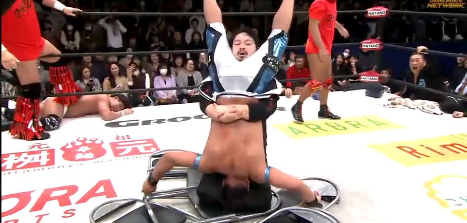 YAMATOがハルクにギャラリアを狙うが、ハルクが逃れるとKAZMAがカットに入ってポップアップパワーボムを決め、KAZMAとハルクがトレイン攻撃、連係からサンドイッチニー、ハルクが旋回式EVOP、KAZMAが掌底とYAMATOを追い詰めるも、もう一発はYAMATOが全知全能のフランケンシュタイナーを決め、勝負あったかに見えたが、レフェリーのカウントはH・Y・Oがイスで一撃して阻止し、ここでR.E.D、DRAGON GATEのセコンドが雪崩れ込んで大乱闘となってしまう。