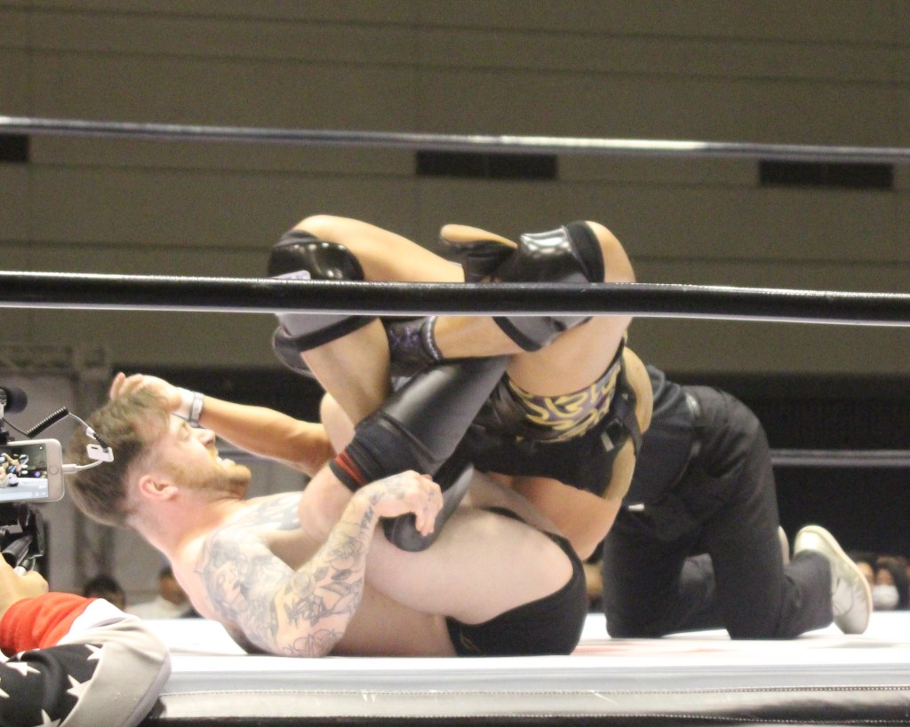 鼓太郎はエルボーで流れを変えるとエンドレスワルツで丸め込み、エクスガリバーから三沢魂ランニングエルボー、アッパー掌底、ローリングボディーエルボーと浴びせ、三沢魂ローリングエルボーを炸裂させる。