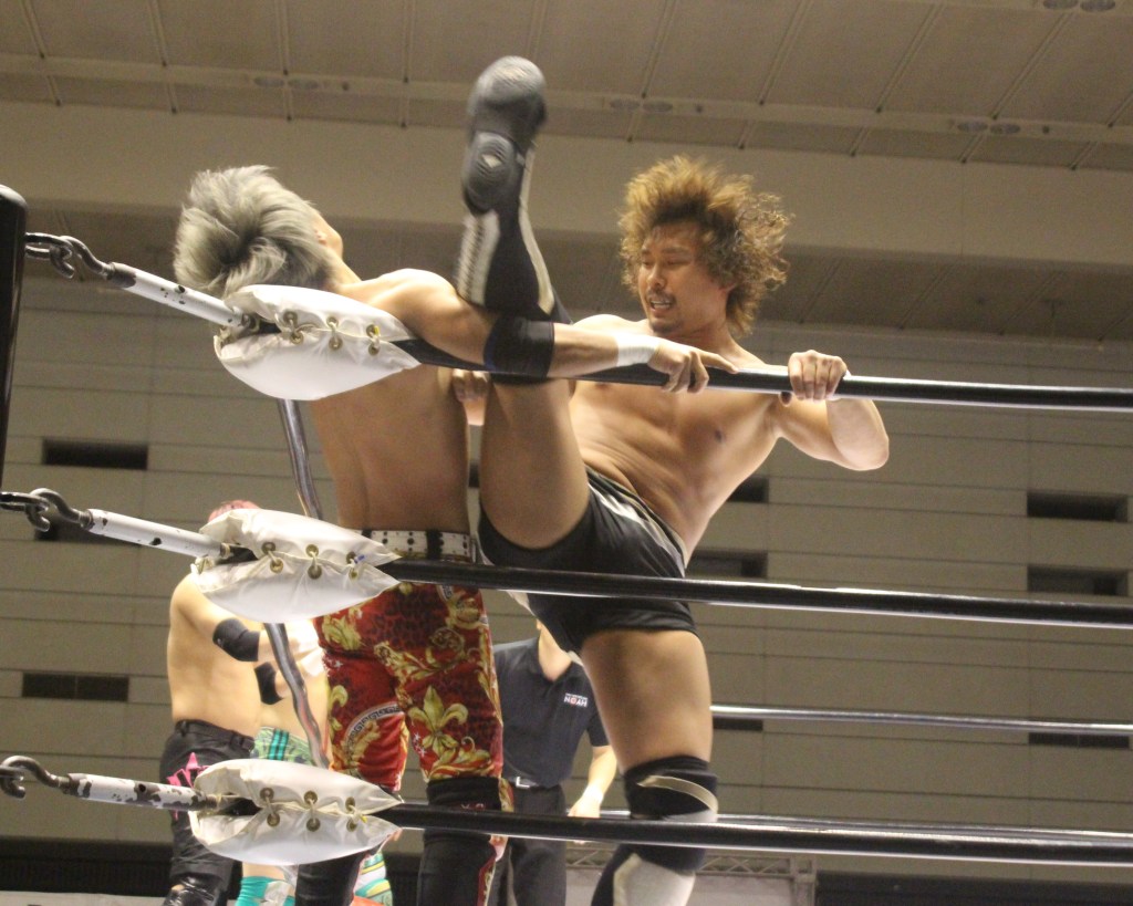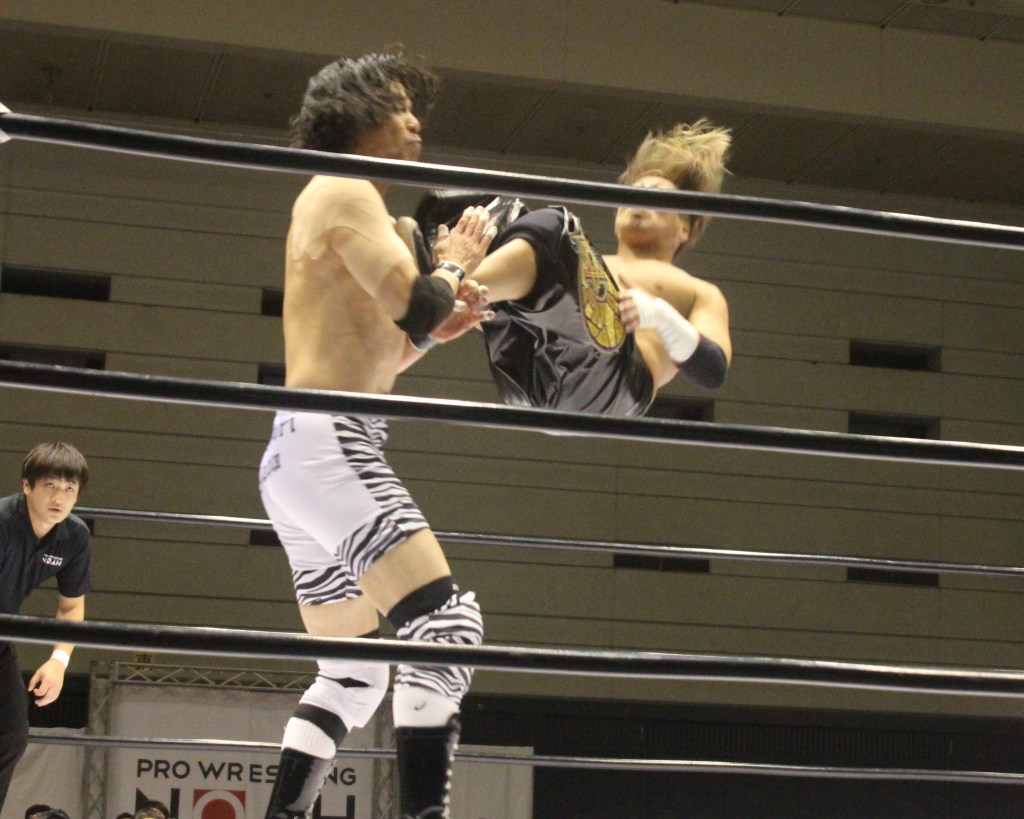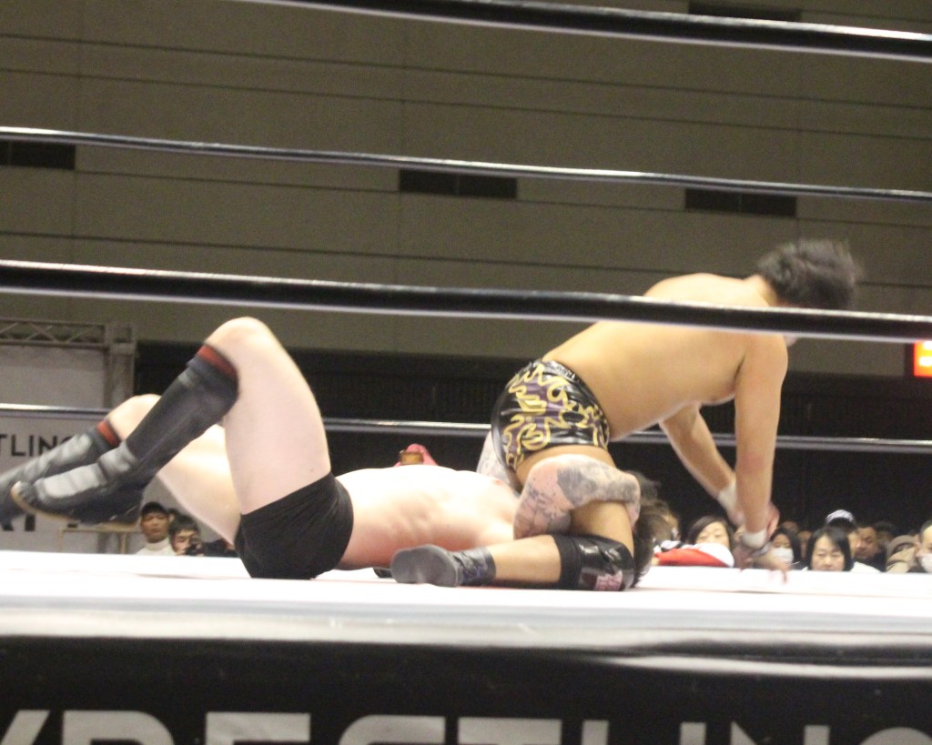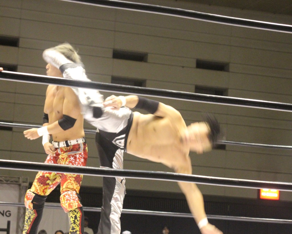 大原はフィンランド式フォアアームを狙ったが、レッグシザースで大原をセカンドロープにセットしたYO-HEYは後頭部めがけてダブルニーアタックを発射、カサドーラ式フェースクラッシャーと反撃も、大原は風車式バックブリーカーで応戦、バックドロップは着地されてもスピンキックを浴びせた大原は予告なしのムイビエンで捕獲、しかし突進したところでYO-HEYはYOロールで丸め込み、キックアウトした大原にツイストアンドフェイドを決める。