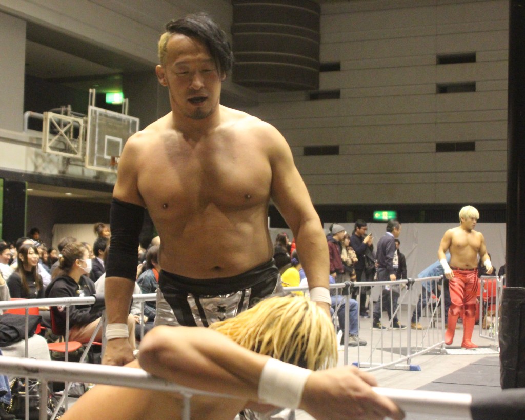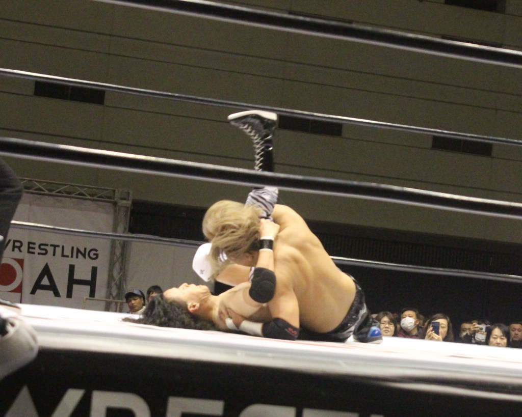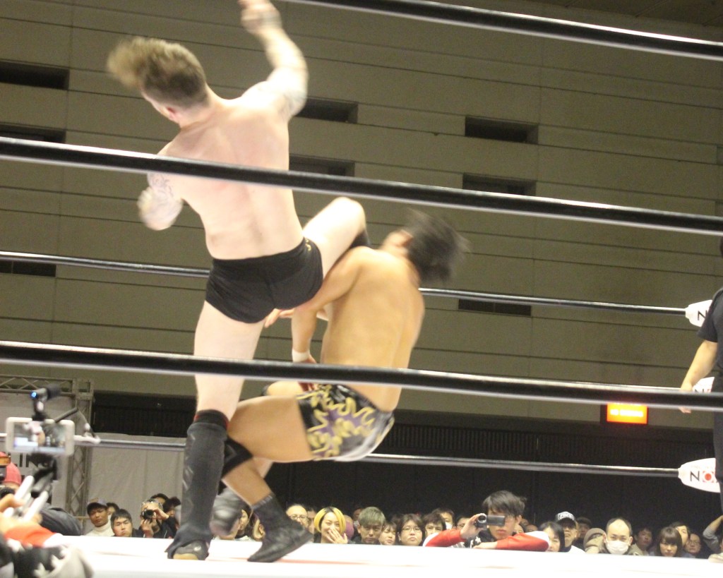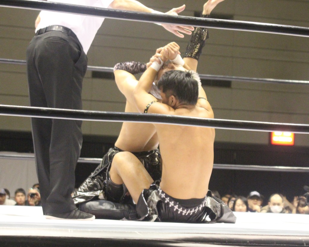 大原はフィンランド式フォアアームを狙ったが、レッグシザースで大原をセカンドロープにセットしたYO-HEYは後頭部めがけてダブルニーアタックを発射、カサドーラ式フェースクラッシャーと反撃も、大原は風車式バックブリーカーで応戦、バックドロップは着地されてもスピンキックを浴びせた大原は予告なしのムイビエンで捕獲、しかし突進したところでYO-HEYはYOロールで丸め込み、キックアウトした大原にツイストアンドフェイドを決める。