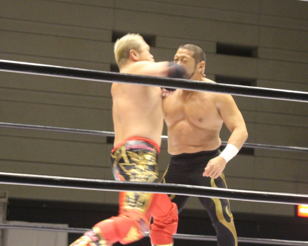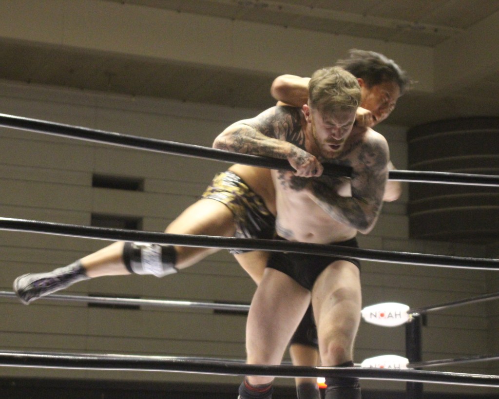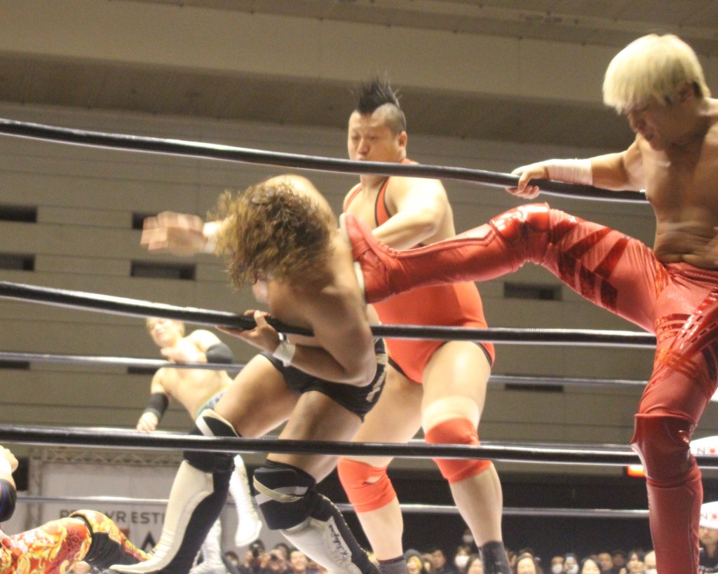 リッジウェイは四つん這いの原田に踵落としを浴びせると、PK、バックの奪い合いからリッジウェイがニー、ジャーマンスープレックス・ホールドと畳みかけるが、パッケージジャーマンを堪えた原田を逆さ押さえ込みで丸め込んだところで、切り返した原田がフットスタンプを投下、リッジウェイのボディーにエルボー、ターンオーバーニーと畳みかけ、片山ジャーマン狙いをロープに逃れようとしたところで背後からジャンピングフォアアーム、ニーアッパーを放つ。