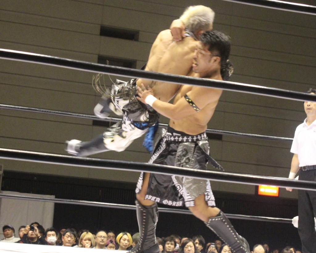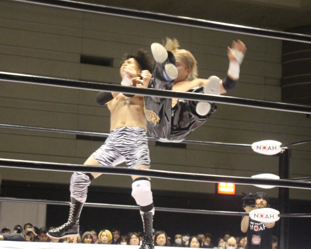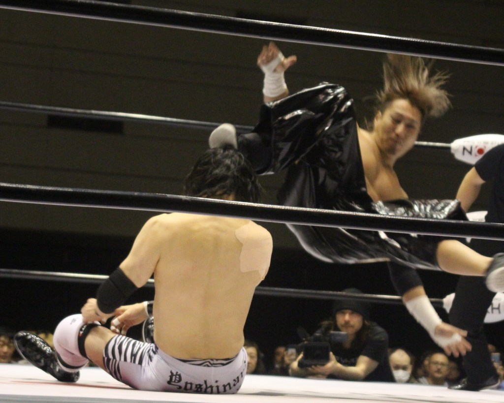 コーナーからのティヘラで反撃したYO-HEYはドロップキックを放ち、後頭部めがけてヒールキック、スイング式ネックブリーカーと攻め込むが、突進したところで大原はバックブリーカーで反撃、ジョンウーや低空ドロップキック、スイング式バックブリーカーなど様々なバックブリーカーを駆使して再びリードを奪う。