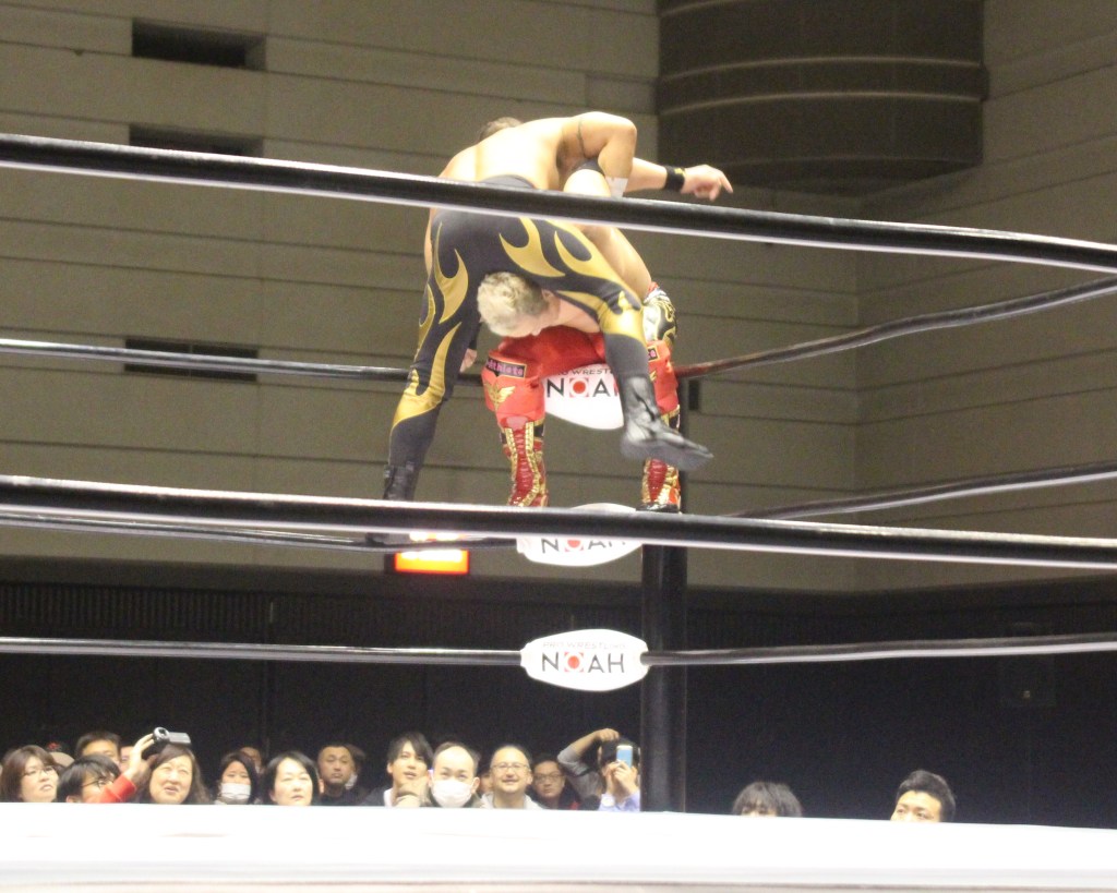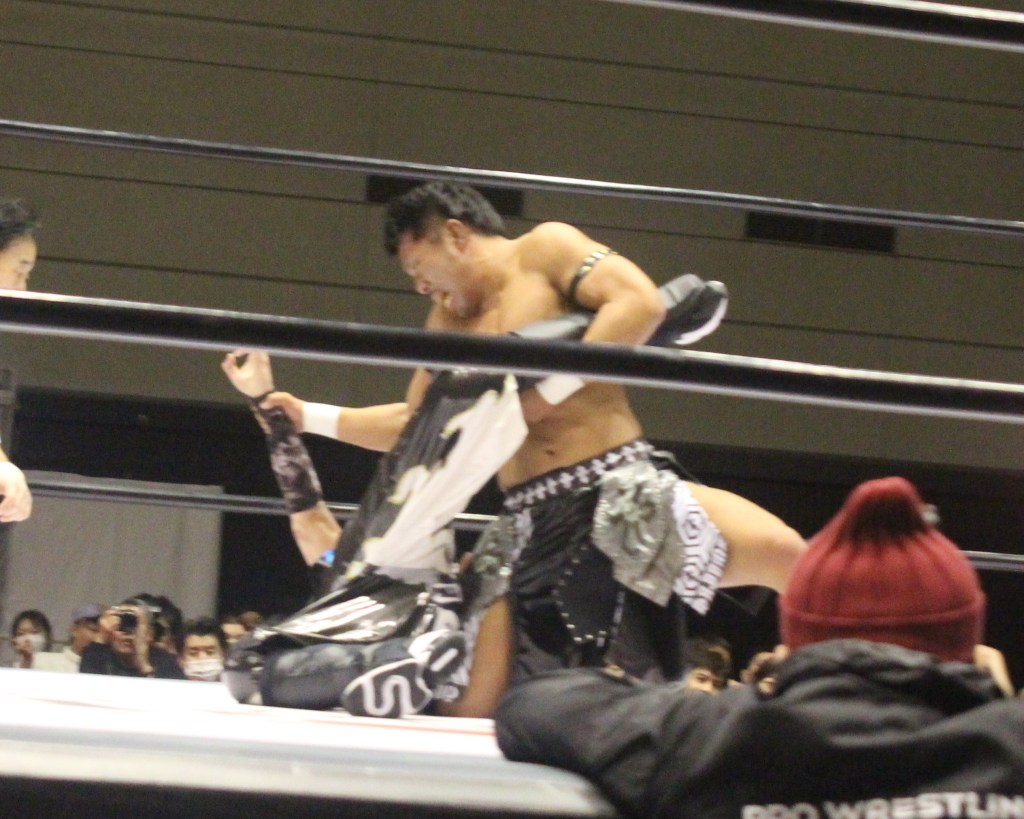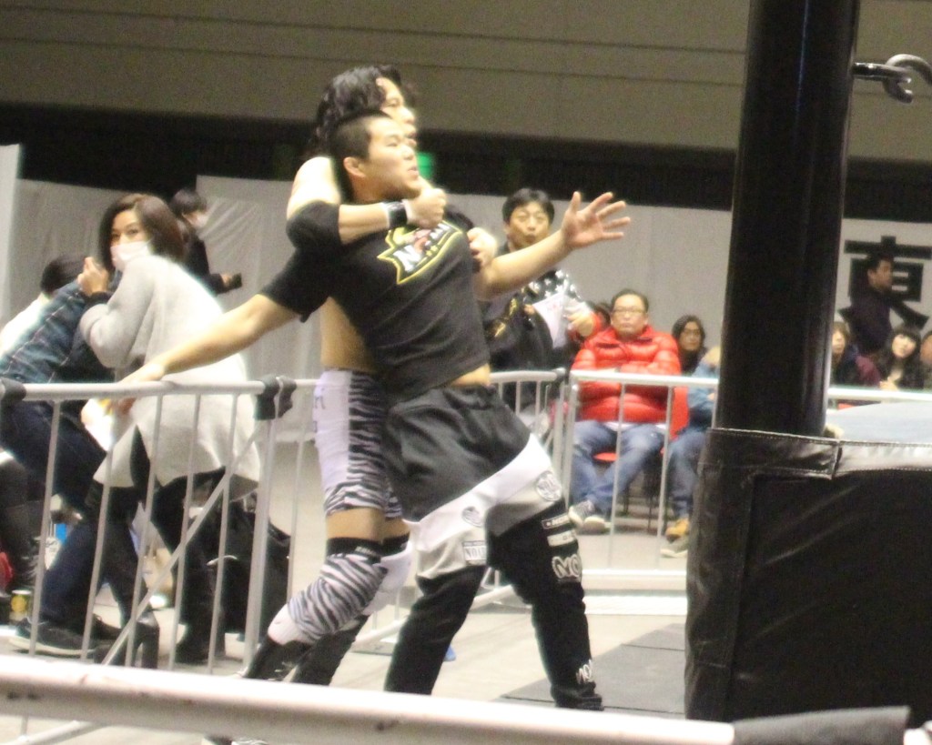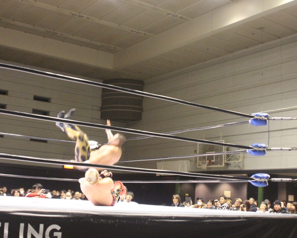 鼓太郎はブルーディスティニー、エプロンの攻防で断崖式での三沢魂タイガードライバーを狙ったが、東郷は断崖式フランケンシュタイナーを敢行、すかさずトペコンヒーロを命中させる。