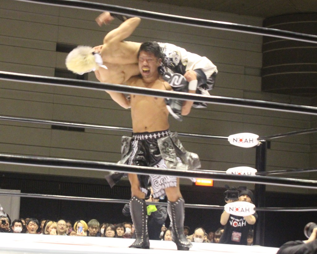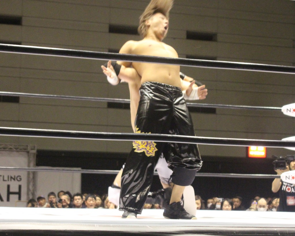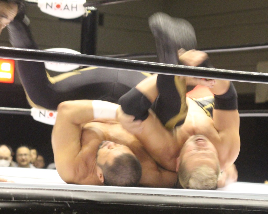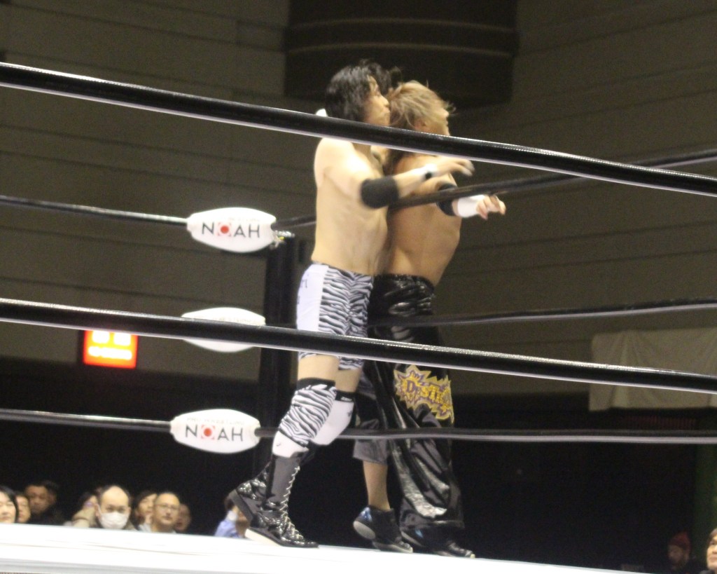 終盤ではAXIZが稲村を捕らえ、逆水平&ミドルキックのサンドバックタイム、フィッシャーマンズバスター&トラースキックで蹂躙、それでも懸命に粘る稲村を潮崎が豪ハンマーを浴びせ、豪腕ラリアットで3カウントを奪い勝利、試合後は中嶋の撮影でネット配信向けに潮崎が「オレがNOAHだ!」と叫んで大会を締めくくった。