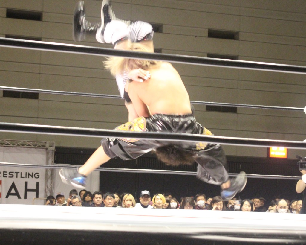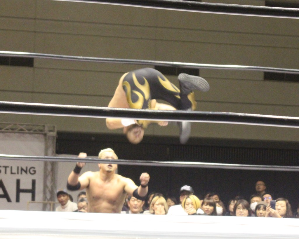 劣勢のHAYATAはハンドスプリングエルボーで反撃、エプロンに出た小川にハンドスプリングキックで場外へ落とすと、ノータッチトペコンを発射、リングに戻ってからフェースクラッシャー、ジョンウー、スイングDDTと猛追をかけ、フロントネックロックを狙う小川をブレーンバスターで投げる。