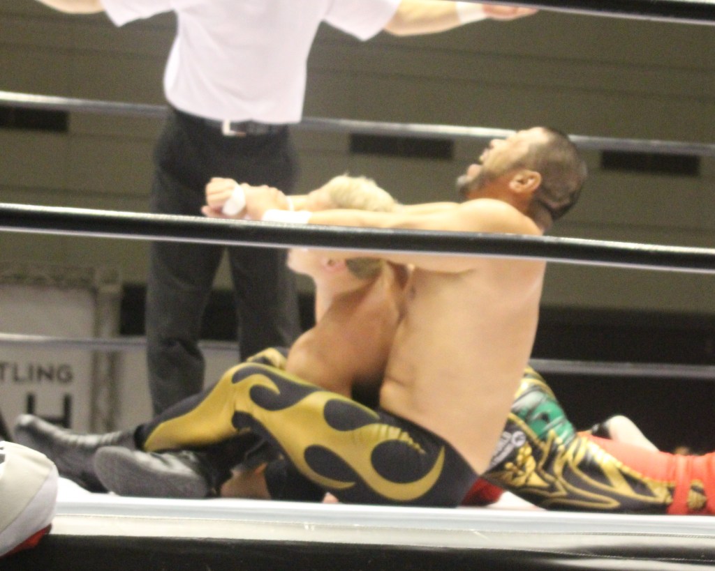 逃れた鼓太郎はヘッドロックを狙うが、切り返した東郷はクリップラーフェースロックで捕獲、徹底した首攻めで鼓太郎にリードを許さない。