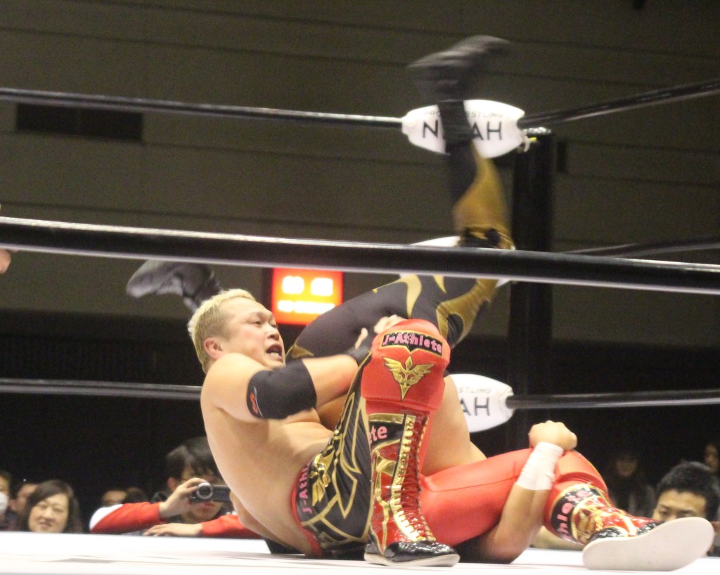劣勢の鼓太郎はエルボーで反撃、串刺しニー、ファンネル、ピットと浴びせるが、東郷も首投げからオクラホマロールで丸め込むと、すぐさまクリップラーフェースロックで捕獲、鼓太郎は丸め込んで逃れる。
