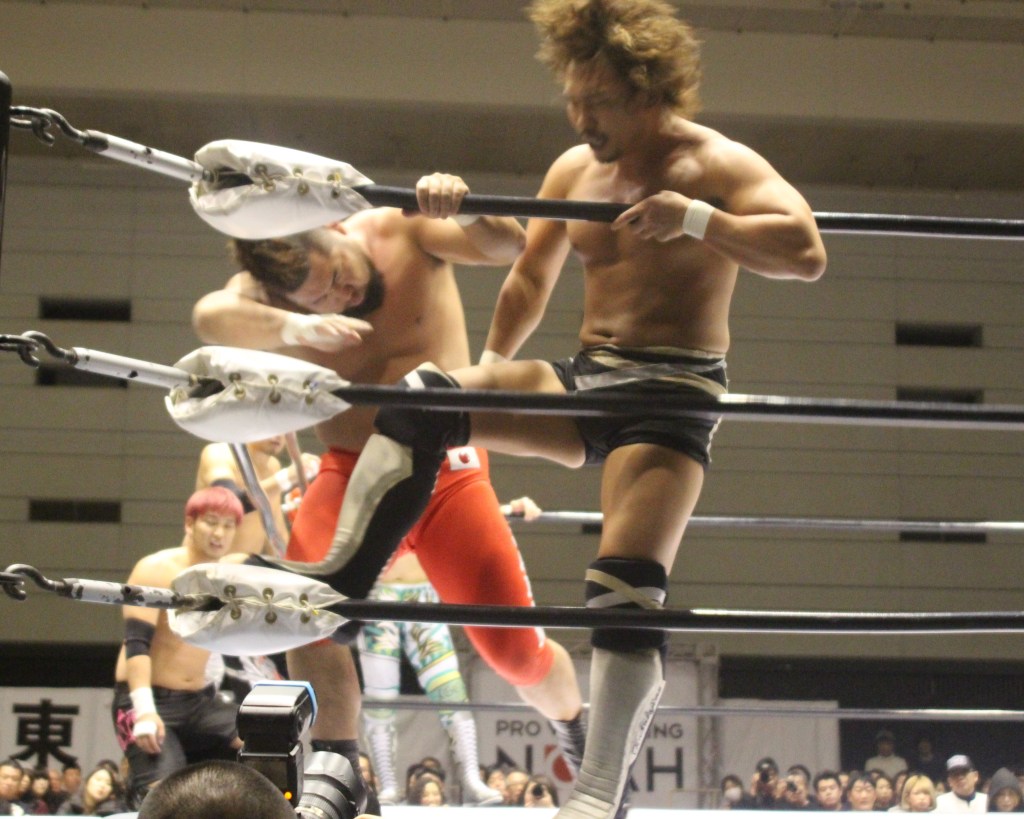 リストロックの攻防も、HAYATAはマンハッタンドロップからサイドへのドロップキック、ミサイルキックで小川を場外へ追いやると、HAYATAはすかさずプランチャを発射、小川は鉄柵攻撃で反撃も、突進したころでHAYATAはスーパーキックで迎撃して両者場外でダウン、NOSAWAが両リンを狙ったのか、レフェリーに場外カウントが遅いと抗議するも、二人はリングに戻る。