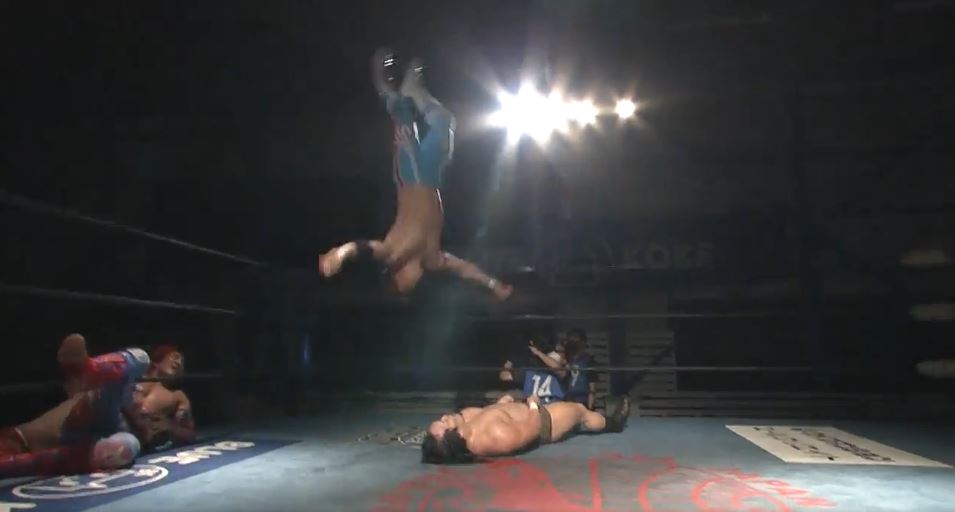 イサミはヨシタツを場外へ排除するとトペスイシーダを発射し、宮本は立花にハンドスプリングオーバーヘッドキックからファイヤーサンダーを狙うが、立花が着地して丸め込みを連発、逆さ押さえ込みも、突進したところで宮本がファイヤーサンダーで突き刺すと、ムーンサルトプレスで3カウントを奪い完勝防衛となった。