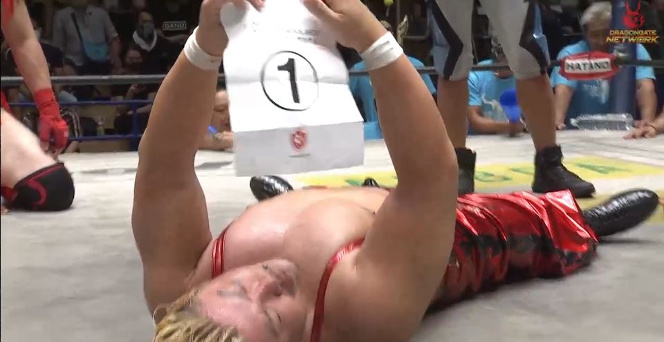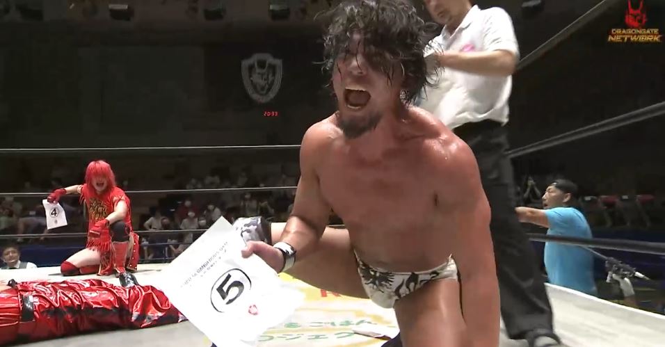 そして吉野とYAMATOは休戦を確認して連係で清水を捕らえ、吉野は清水にトルベジーノ十字固めで3カウントを奪ったが、吉野が引き当てたのは最も不利な6番手で、吉野は頭を抱えて倒れ込んでしまう。
