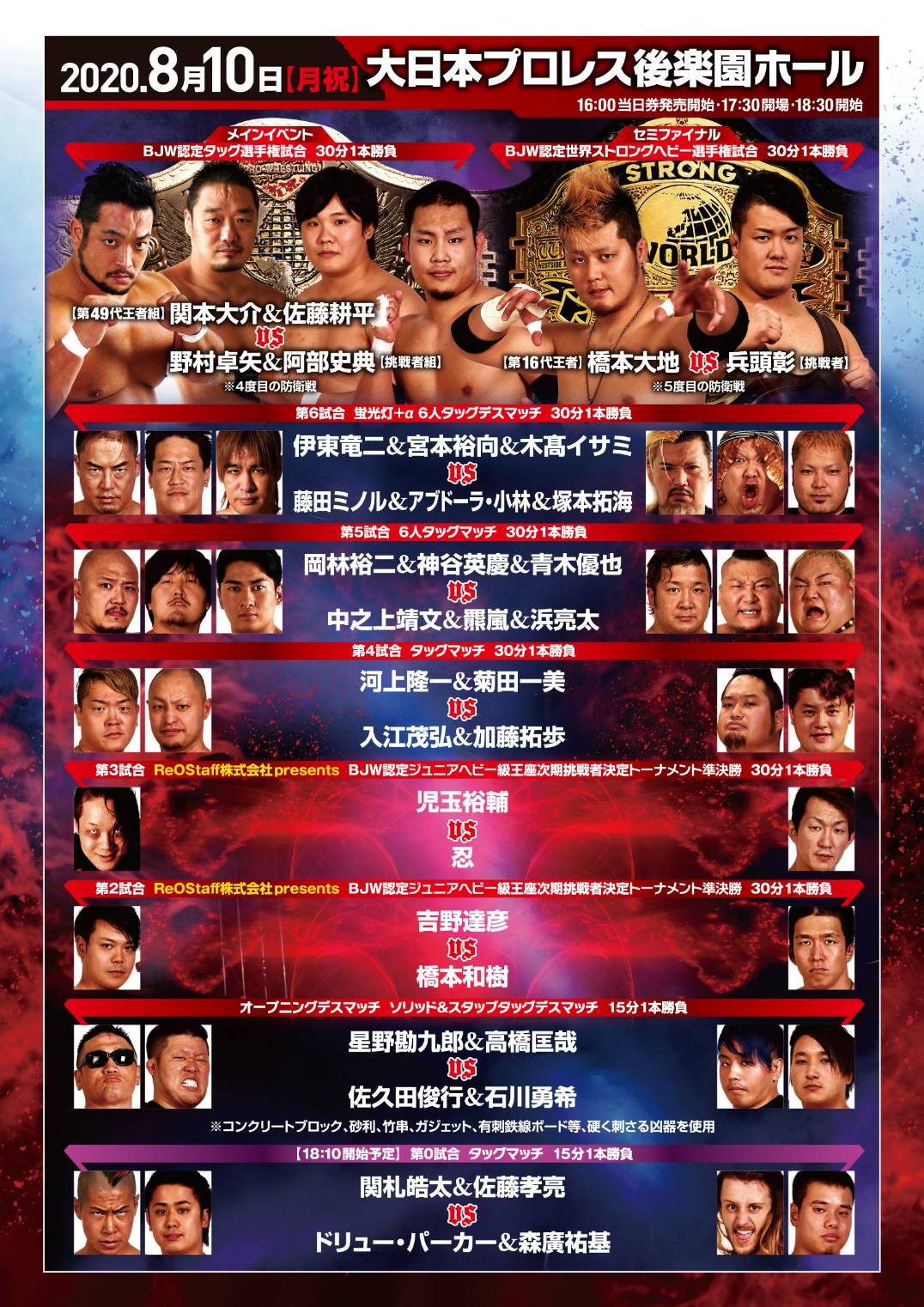 第6試合の8・29横浜文体でのデスマッチ選手権前哨戦は、二丁拳銃の援護を受けた伊東が藤田を攻め込み、二丁拳銃がダブルスライディングキックから伊東がムーンサルトプレスも塚本がカットすると、アブ小の援護を受けた藤田が蛍光灯を持って伊東にダイビングボディープレス投下してクラッシュさせる。