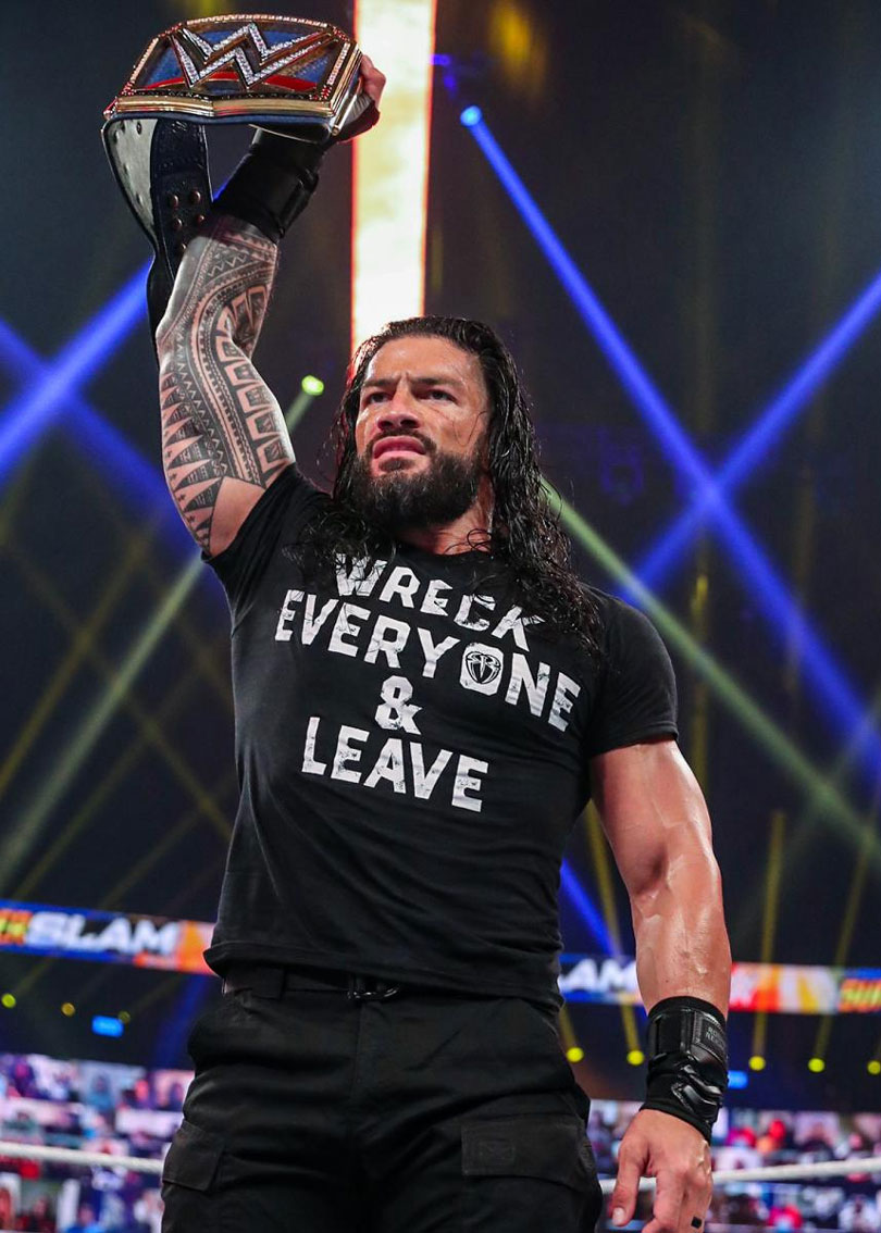 ところが4月から新型コロナウイルス感染拡大の影響で欠場していたロマン・レインズがワイアットをスピアーからマウントパンチでKOするだけでなく、ストローマンにもスピアーを浴びせてKOし王座挑戦をアピールした。