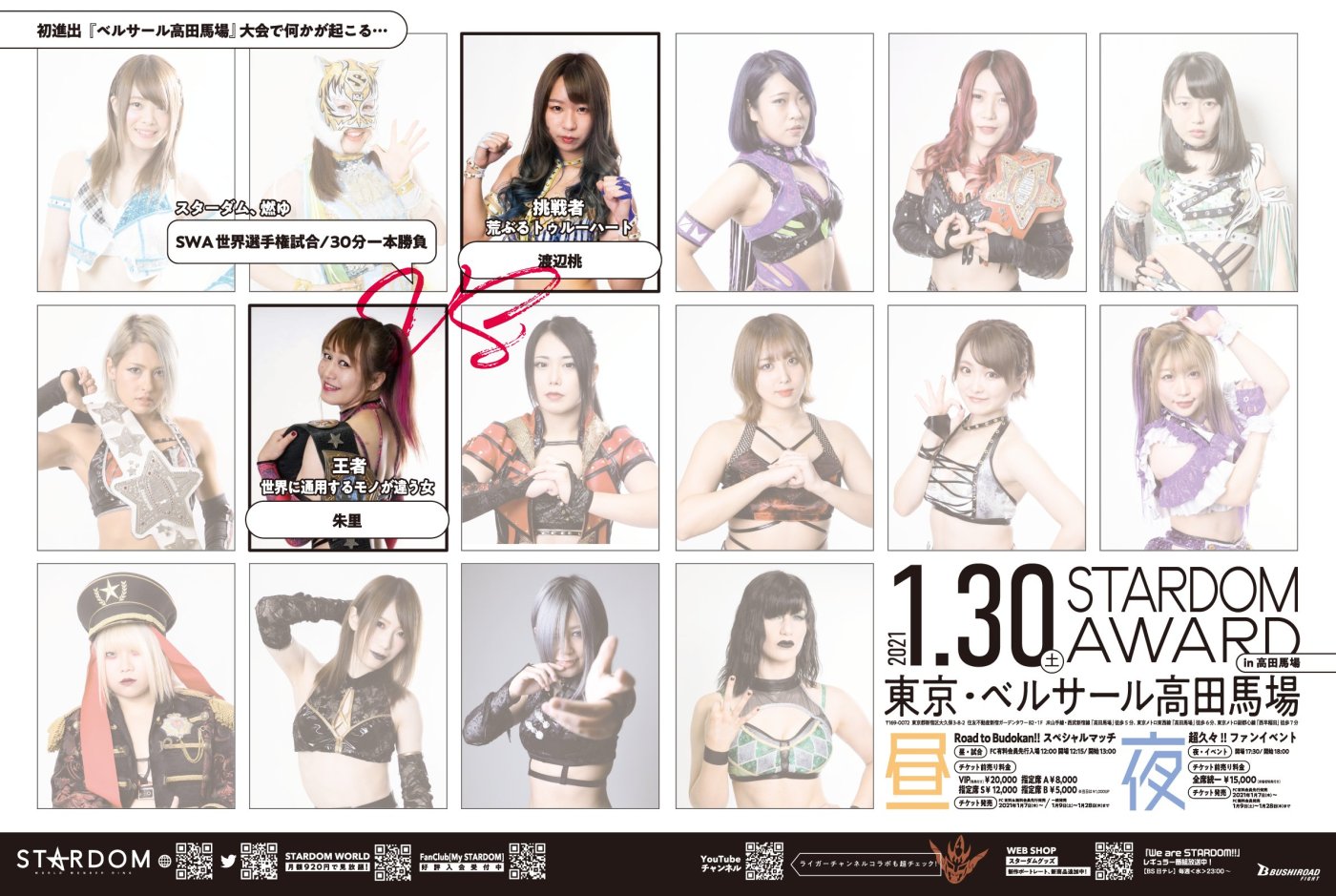 スターダムがベルサール高田馬場に初進出を果たし、メインでは朱里の保持するSWA王座に桃が挑戦、序盤はグラウンドや蹴り合いで互いに出方を伺うも、朱里はストンピングから串刺し狙いは桃が迎撃すると、桃はブレーンバスターの要領でコーナーに朱里を逆さ吊りにすると顔面へローキックを浴びせ、桃はキャメルクラッチで捕らえ、ミドルキックの連打で朱里を場外へ追いやり、エプロンから朱里の背中へサッカーボールキックと腰攻めで先手を奪う。