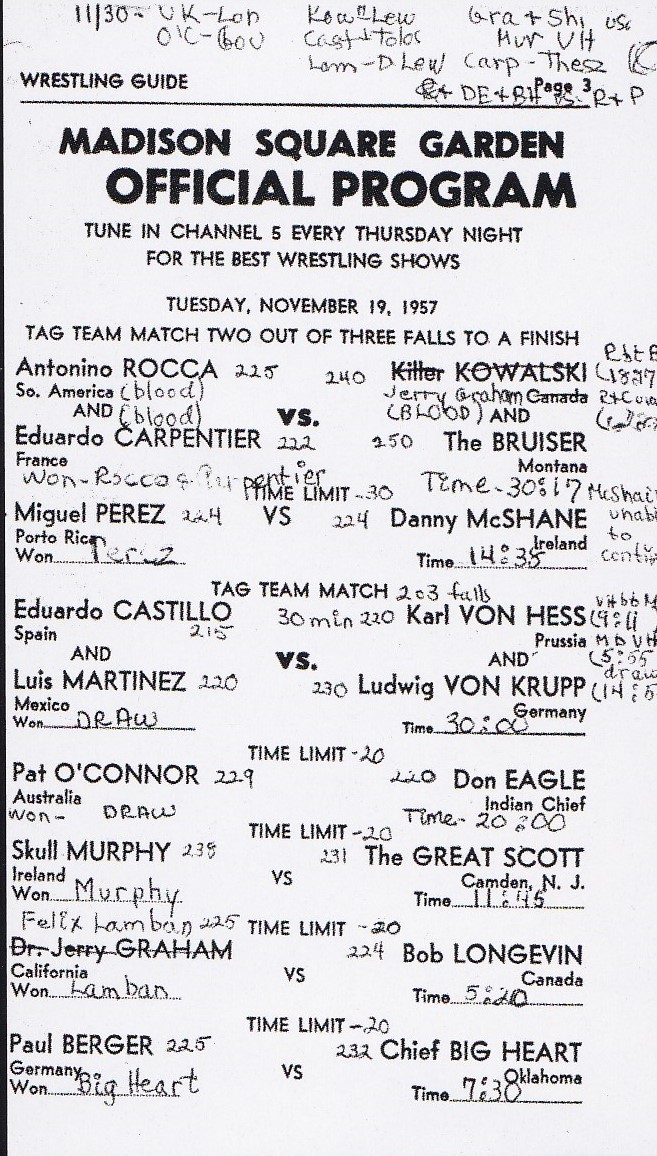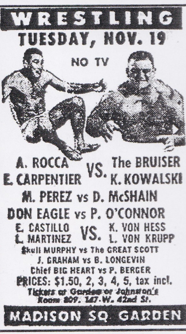 1957年11月19日、マジソン・スクエア・ガーデンの定期戦が行われ、この頃のニューヨークはウォルター・ジョンソンがプロモーターとして取り仕切っており、後にニューヨークを取り仕切るビンス・マクマホン・シニアはワシントンDCのプロモーターであったが、出資者という立場でジョンソンを補佐していた。ロッカの相手としてブルーザーを招き、タッグマッチでロッカはカーペンティアと組んでブルーザー&キラー・コワルスキーをマッチメークされ、ロッカとカーペンティアの2大ベビーフェースがタッグを組み、荒くれものブルーザーと殺人狂のコワルスキーの2大ヒールの迎え撃つ豪華なカードが組まれたことで、MSGは12000人が動員されたが、コワルスキーが飛行機の到着が遅れたため間に合わず、急遽ロッカと手の合うジェリー・グラハムが代役として出場することになった。