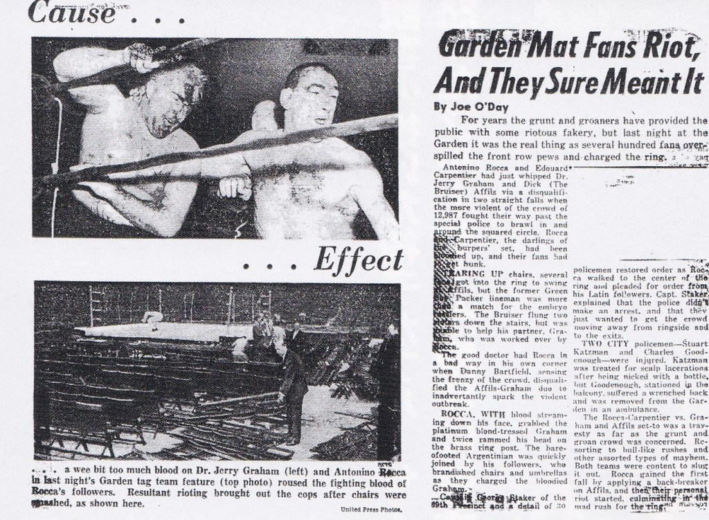 そこでブルーザーが客に向けてイスを投げると、観客もエキサイトしてリングに押し寄せ、次々とイスを投げるだけでなく、2階からビール瓶まで飛び交ってくる。MSG側も異常事態と判断して警官隊を呼び、エプロンに立たたせて投げられてくるイスを防御させる中で、試合は続行されたが、ロッカとグラハムが殴り合いを続けるだけでなく、ブルーザーとカーペンティアも乱闘を続け、リング内にも観客が乱入してブルーザーが追っ払う。そして投げられたイスが警官にも直撃して担架で運ばれる事態も起きてしまったことで、レフェリーは試合続行不可能と判断、ブルーザー&グラハムの反則負けとなり、2-0でロッカ&カーペンティアが勝利も、騒ぎは収まる気配はなく、イスが飛び交い続け、ブルーザーとグラハムの二人は警官隊に取り囲む中でリングから脱出するが、暴動は収束することはなく、遂に観客はリングに雪崩れ込んで、リングが破壊される事態にまで発展、警官も2人負傷してしまった。