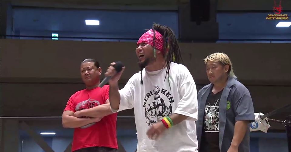 しかしSBKが「一人で何が出来る」と挑発して、YASSHIは用意したパートナーを呼び込むと、出てきたのは3月にアキレス腱を断裂して欠場していた近藤修司と、DDTを主戦場にしている大鷲透が現れ、悪冠一色として改めて挑戦を表明し、これを受けて7・31神戸ワールドで行われるジェイソン&ダイヤ&エストレージャのMASQUERADEvsSBK&ディアマンテ&インフェルノのR.E.Dのトライアングル選手権の勝者に8・1で悪冠一色が挑戦することが正式に決定した。