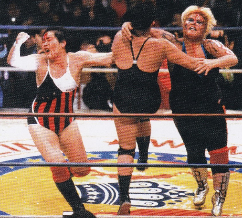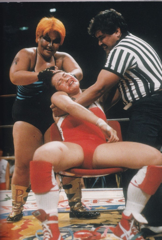 長与は紋付羽織袴の男子姿で登場したのに対し、ダンプは覆面マネージャーと共に、お馴染みの極悪ファッションの通常コスチュームで登場するが、中身はダンプの影武者だった影かほるで、その傍らでいた覆面マネージャーがダンプだった。まさかの替え玉作戦という奇襲を受けた長与は防戦一方となり、凶器攻撃を食らい続けた長与は大流血となってKO負けを喫してしまった。