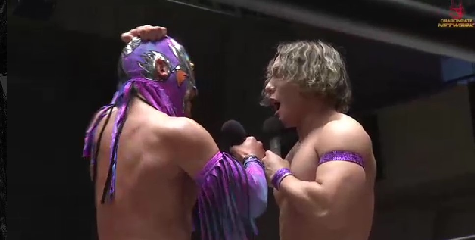 そして後楽園大会は全カード当日発表となったが、メインイベントではオープン・ザ・トライアングルゲート選手権が組まれ、王者のシュン&箕浦&ジェイソンのMASQUERADEに、前王者組のEita&石田&H・Y・OのR.E.Dが挑戦、組み合わせ的には12・15後楽園の再戦となるも、Eitaと石田はやる気がない態度のままで登場するのに対し、MASQUERADEは正装を着用してきたのはシュンだけで、箕浦とジェイソンもやる気のないままリングインするなど、試合前からH・Y・Oとシュンが双方のユニットから孤立していることを伺わせてしまい、開始となってもEitaと石田は場外へ降り、シュンもジェイソンと箕浦に連係を指示するが拒否されるなど、不穏な空気のままで試合が進んでしまう。