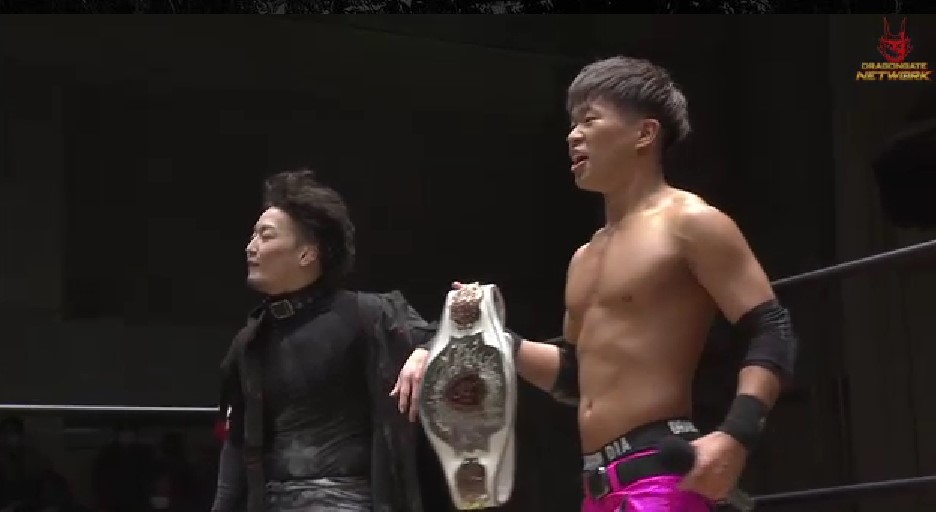 それでもEitaと石田、ジェイソンと箕浦は渋々試合には加わるが、終盤になると箕浦がロープへ走るとセコンドのSBKがボックスで一撃を浴びせ、そこでシュンが入ってH・Y・Oを捕らえると箕浦がボックスで一撃を狙うが、シュンに誤爆したところでH・Y・Oが丸め込んで3カウントを奪い、R.E.Dが王座を奪取する。