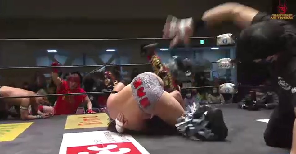 ダイヤは場外のSBKにトペコンヒーロを命中させ、リングに戻ってディープインパクトと攻め込むが、ロープに走るとH・Y・Oが足を取って倒してパウダー攻撃を狙う、そこでインフェルノが駆けつけると、味方だと思ったH・Y・Oはインフェルノにパウダーを渡してしまうが、インフェルノはH・Y・Oに投げつけて、マスクを取り改めて吉岡有己の顔を出し、それに気を取られたSBKにダイヤがレプテリアンを決めて3カウントを奪い王座奪取に成功、R.E.Dの全タイトル制覇は一瞬にして終わってしまった。