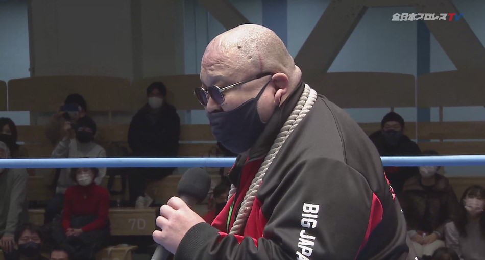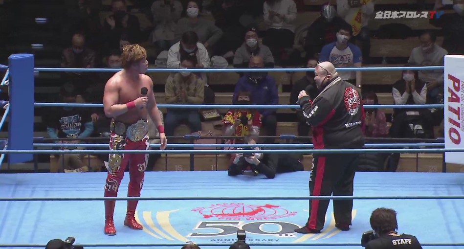 宮原は「ジェイク・リーがこのベルトを返上し、トーナメントが行われた。その結果、宮原健斗が巻いている。怪我だろうが、どんな理由があろうが、今は俺がチャンピオンだ。おい、全日本プロレスの選手。今日から横一線だ。実績、キャリア、そんなもんを理由にするな。このベルトに挑戦して来い。実績。キャリアは問わない。俺がチャンピオンだ。大きな大きな胸で引き受けようじゃないか。挑戦、誰でもしてこいや」と選手らに呼びかけ、また「2022年、三冠チャンピオンは俺からスタートだ。会場の皆様、そしてテレビをご覧の皆様に聞きたい。2022年、MVP候補のナンバーワンは誰だと思いますか?」と煽り、「満場一致で宮原健斗です!」と断言し、恒例の宮原劇場で締めくくろうとしたが、2日にジェイクに挑戦するはずが、ジェイクの欠場で挑戦は白紙にされ、自称”暫定”三冠ヘビー級王者とアピールしていた大日本プロレスのアブドーラ・小林が突如現れる。
