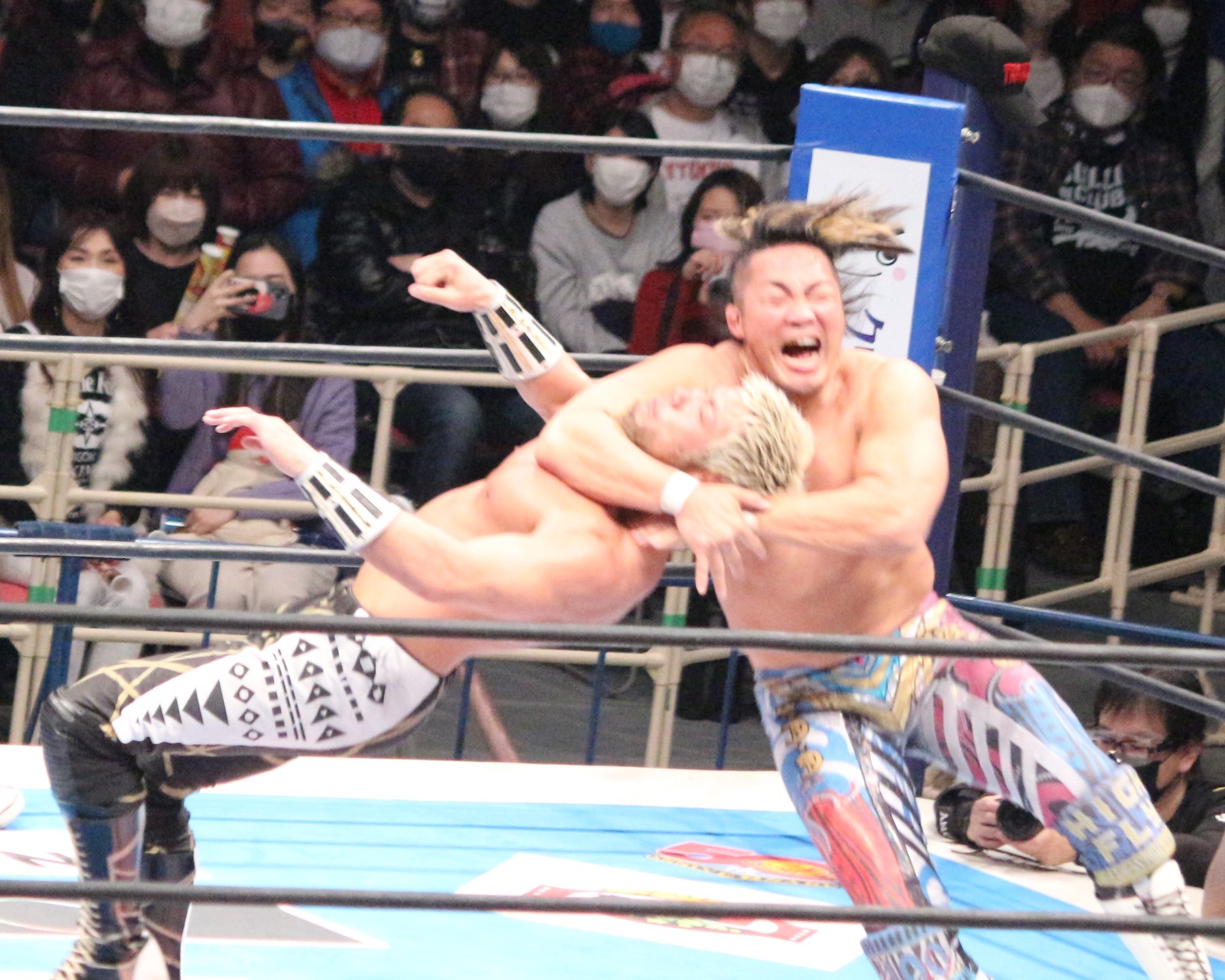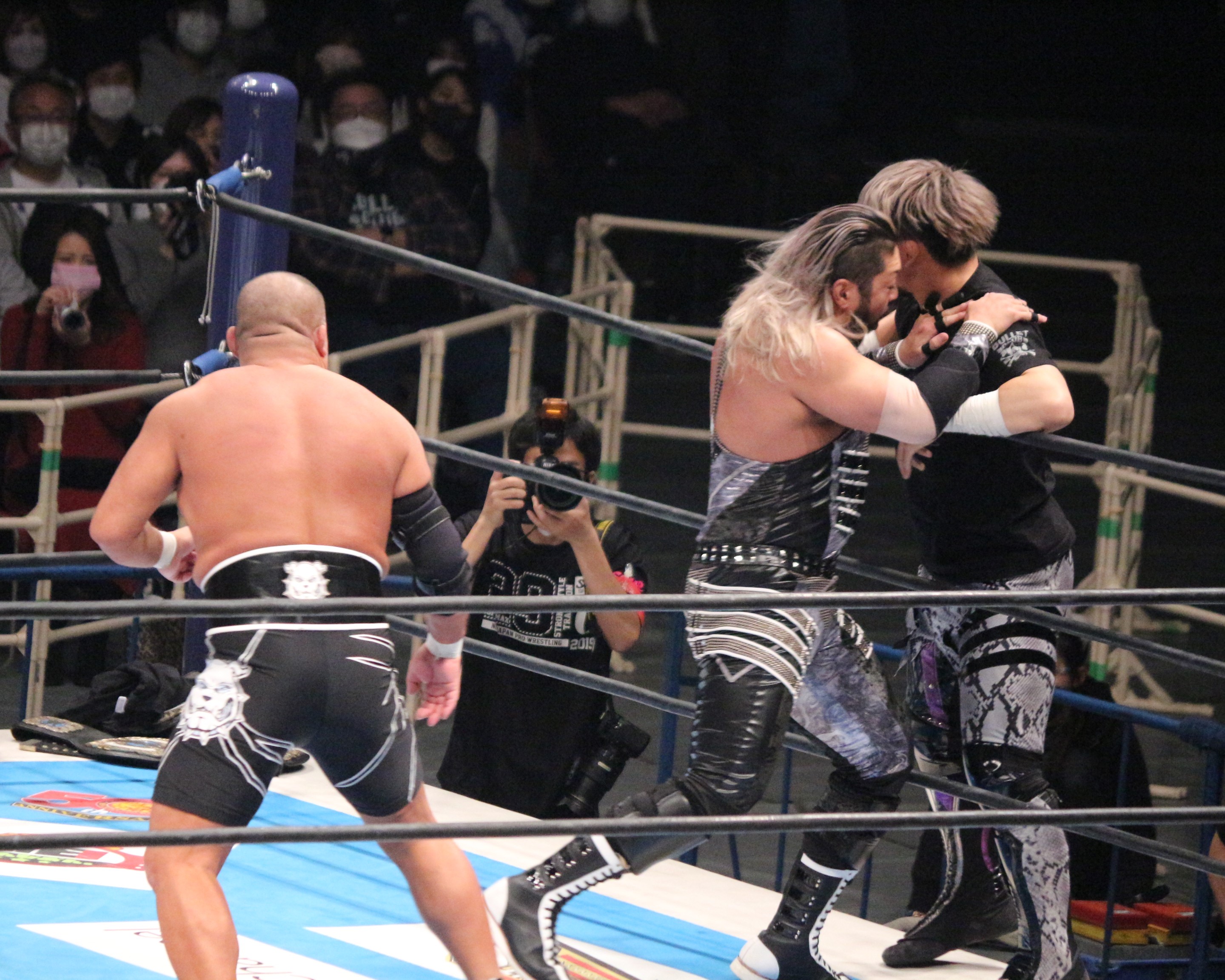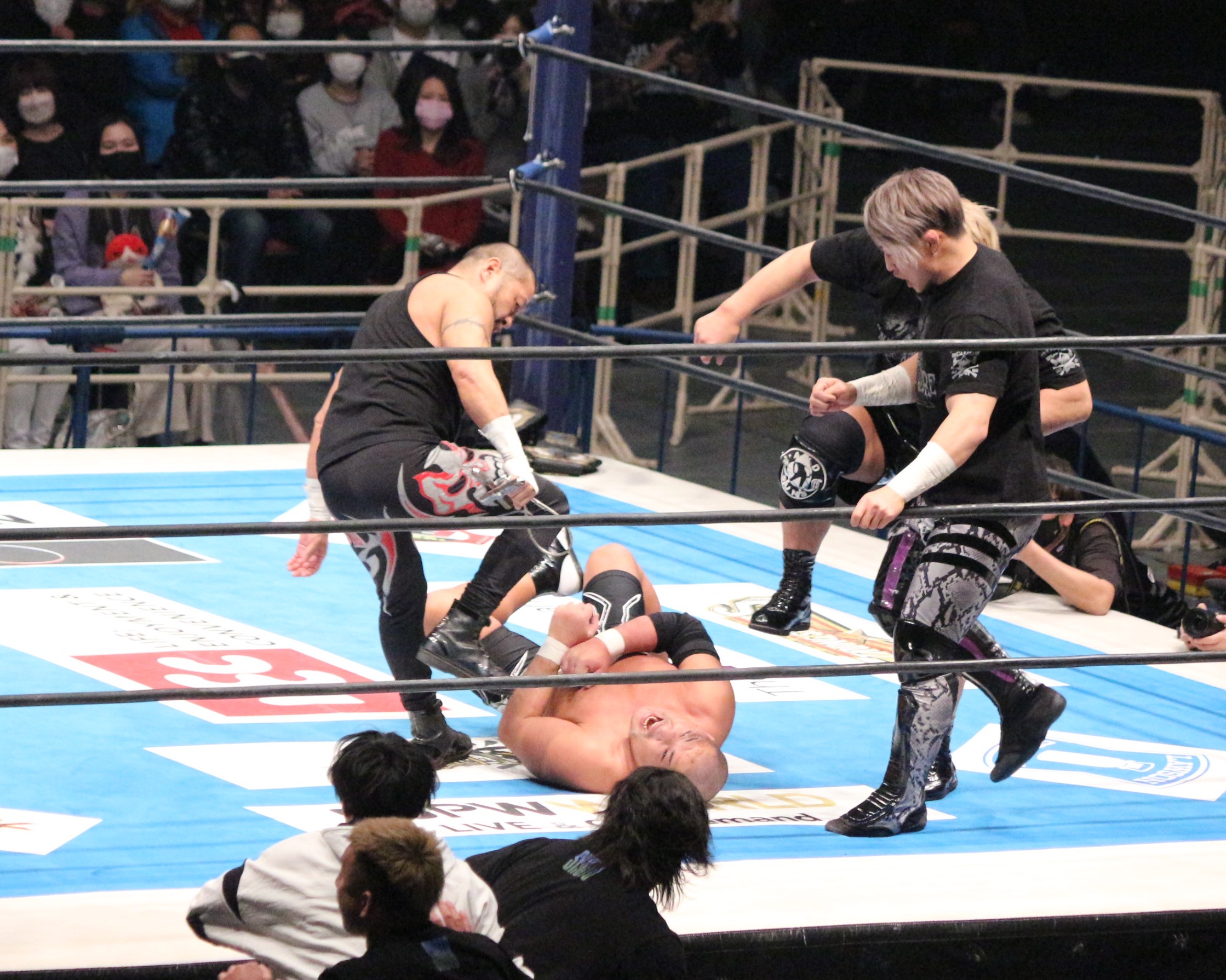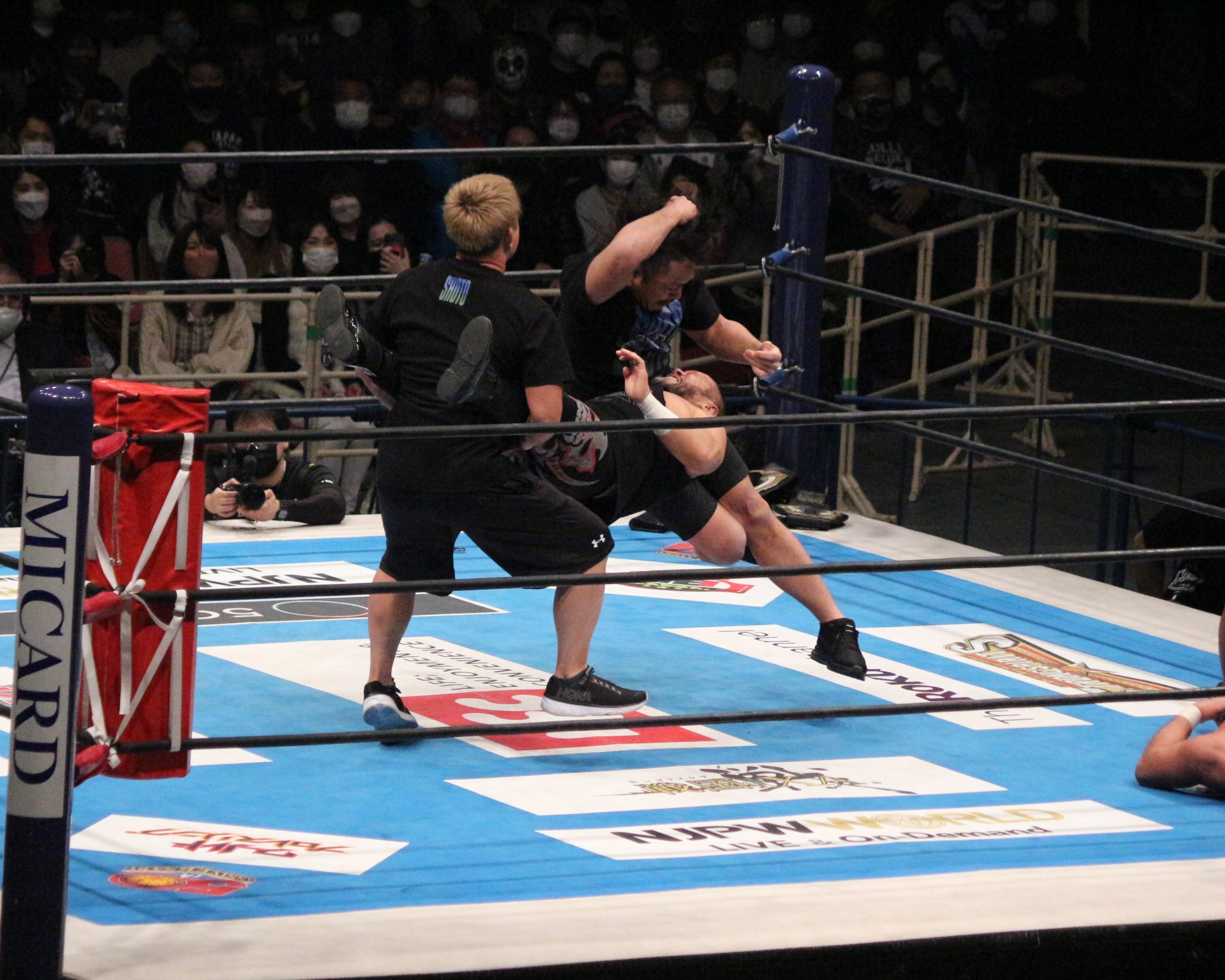 〇鷹木信悟 高橋ヒロム BUSHI(10分18秒 体固め)タイチ 金丸義信 ×DOUKI