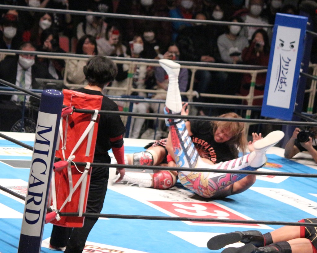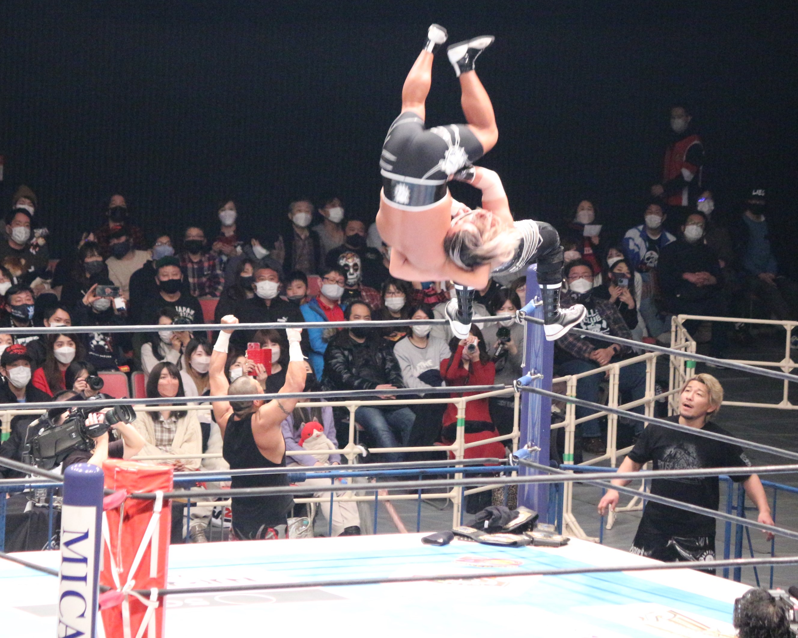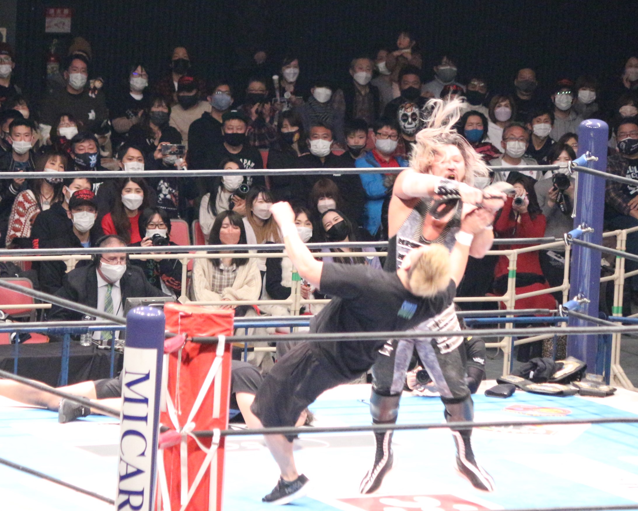 ところが感染症の影響で欠場し今大会から復帰の石森が乱入してタイガーに襲い掛かったため、ファンタズモの反則負けになるも、石森はタイガーのマスクを剥ぎ取ってしまう。