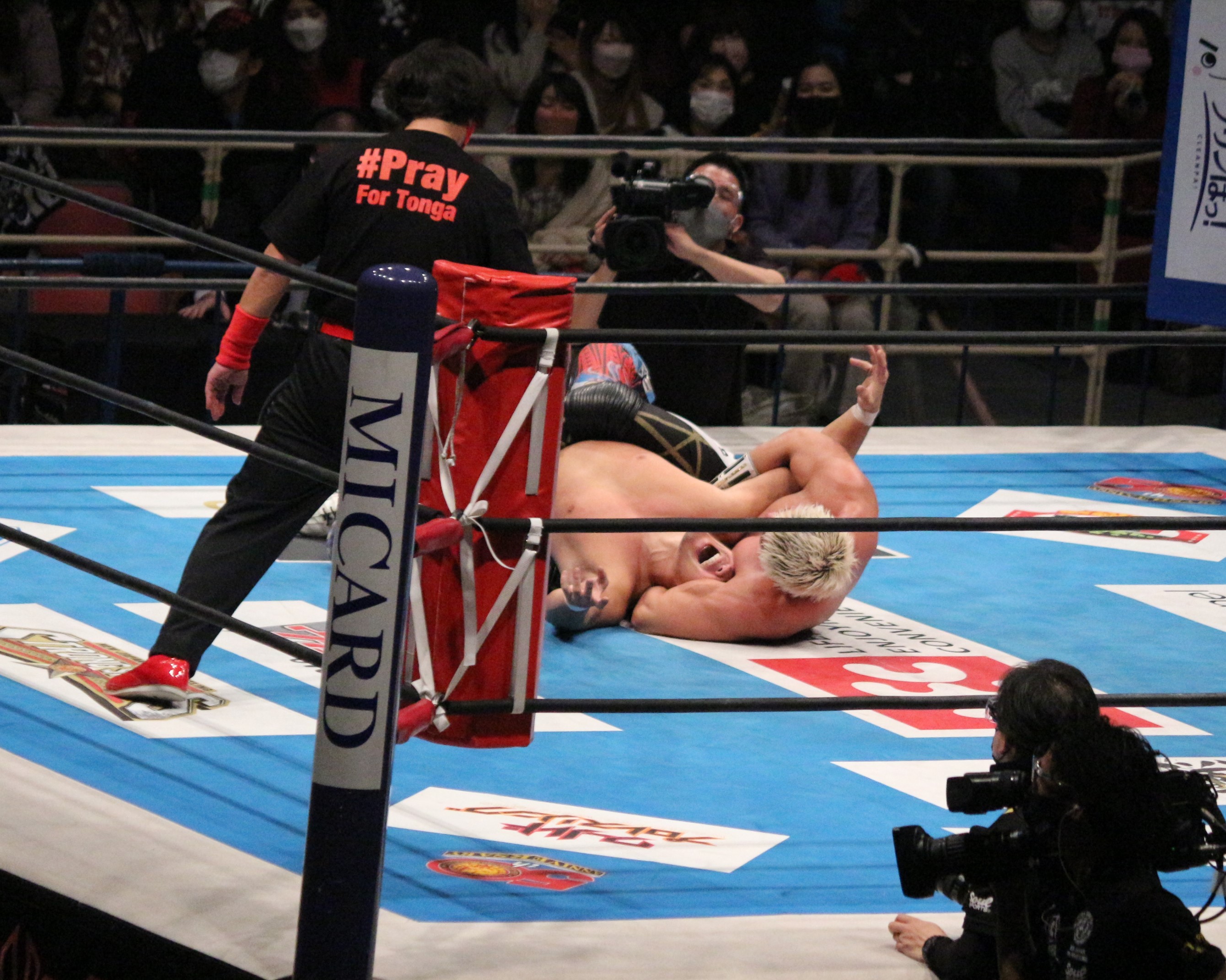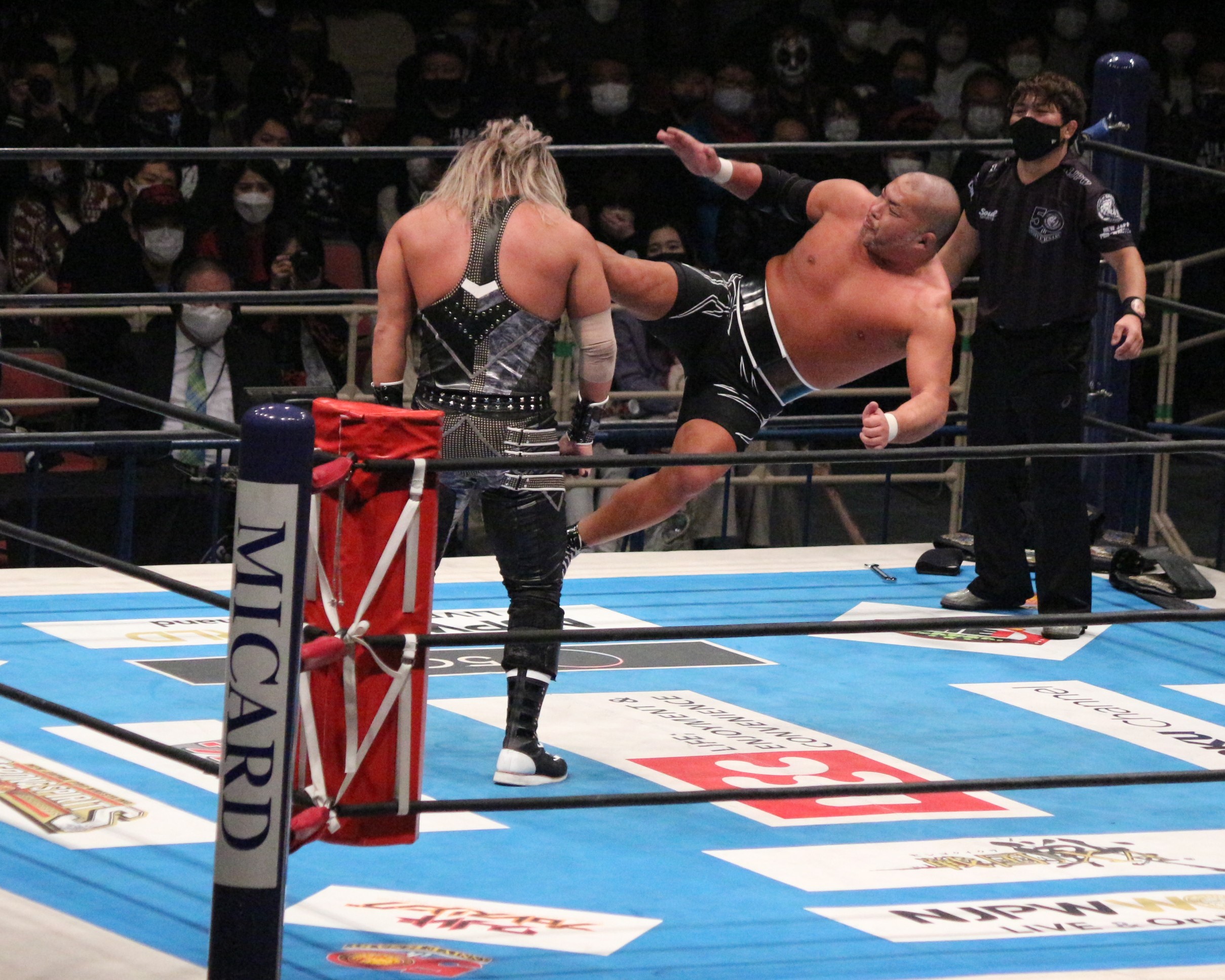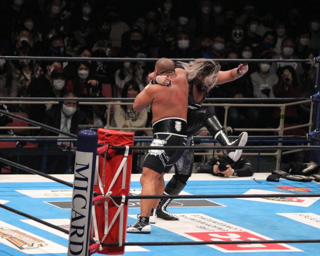 2022年度初の新日本プロレス大阪大会のセミではEVILの保持するNEVER無差別級王者に前王者の石井が挑戦、今回はリングの四方を対戦者以外のレスラー数人(がセコンド役となって取り囲み、選手がリングから落ちた際、すぐさまリング内に押し戻すランバージャックデスマッチということで、セコンドには裕二郎、東郷、SHOのHouse of Tortureと後藤、今大会から復帰のYOSHI-HASHI、SHOの6選手がリングを取り囲んだ。