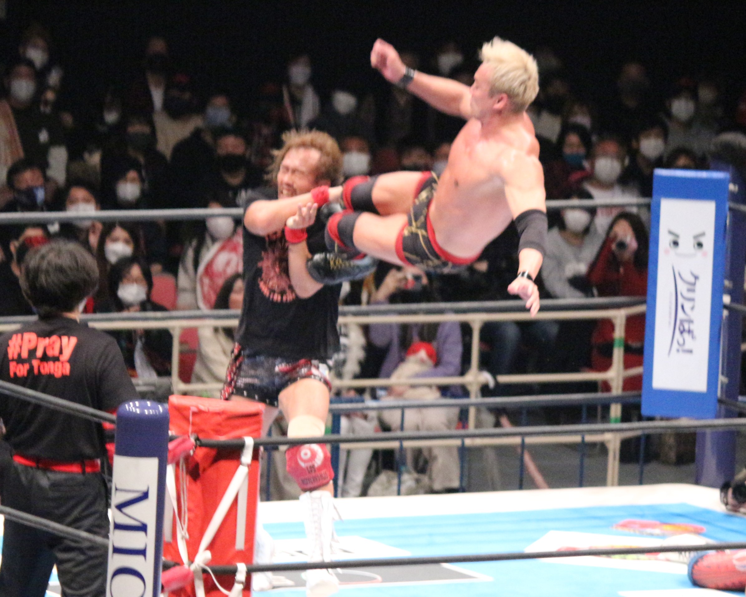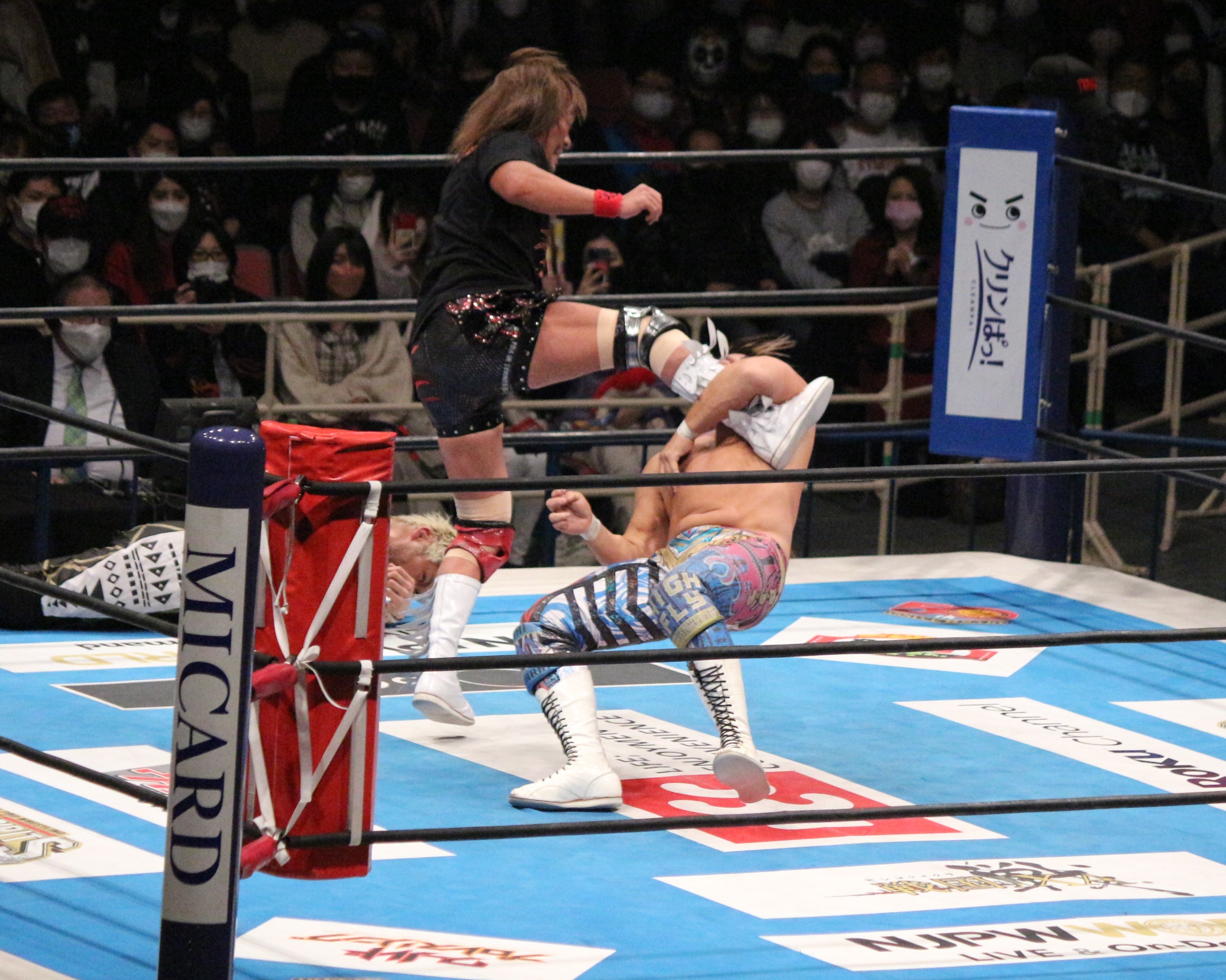 メインイベントは2・19、20月寒大会の前哨戦が行われ、内藤はSANADAと組んでオカダ&棚橋と対戦した。
