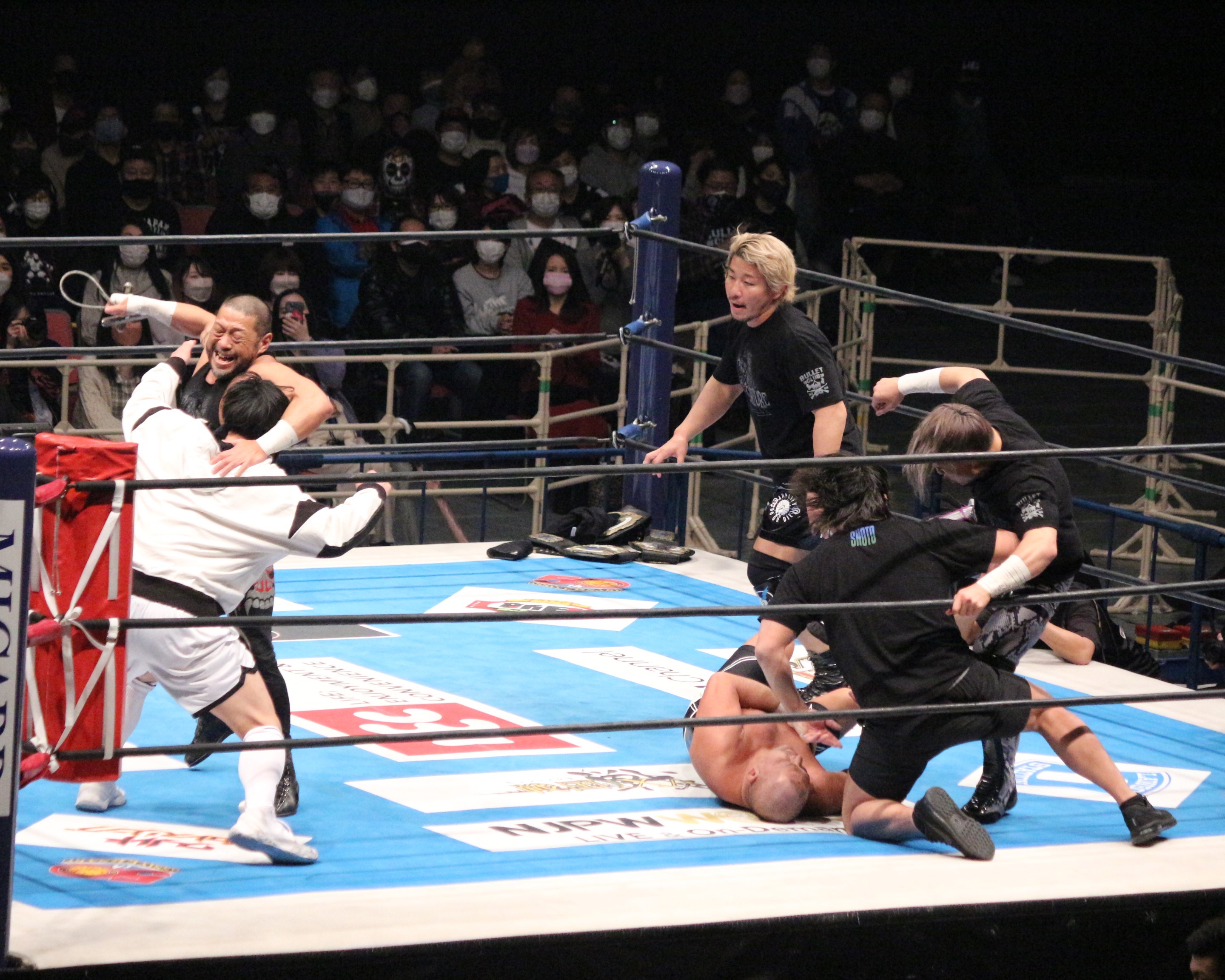 石井は串刺しラリアットから雪崩式ブレーンバスターでEVILを落とすと、リキラリアットを狙うが、EVILが避けたところでSHOが乱入してスピアーを浴びせると、背中を見せていた浅見レフェリーと石井を交錯させて、浅見レフェリーを場外へ落としてKOしてしまい、House of Tortureがリングに上がって石井を袋叩きすると、CHAOSもリングに上がって乱闘となり、各選手の大技が乱舞されて大乱戦、EVILもYOSHI-HASHIをベルトで殴打して、石井にも狙うが、石井はリキラリアットでベルトごとEVILをなぎ倒す。
