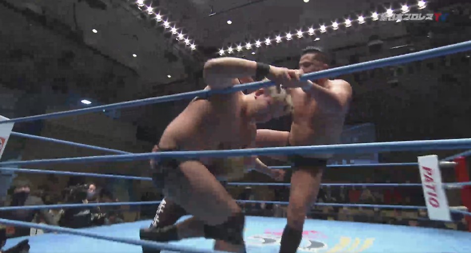 アブ小は四つん這いのままで宮原に頭突きの連打、地獄突き、裏拳と浴びせるが、ヘビーローテーションは宮原がブラックアウトで迎撃で迎撃すると、ブラックアウトを連発するが、アブ小は背中で受け止める。しかし宮原は構わずブラックアウトを炸裂させると、二段式ジャーマンスープレックスホールドはアブ小はカウント2でキックアウトするが、宮原はもう1度二段式ジャーマンスープレックスホールドで3カウントを奪い王座を防衛した。