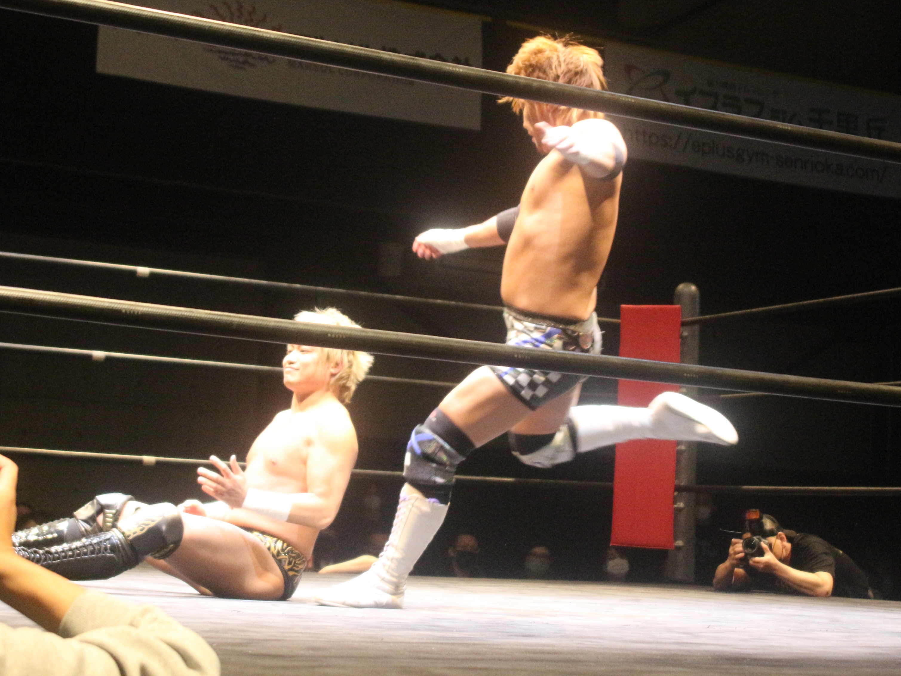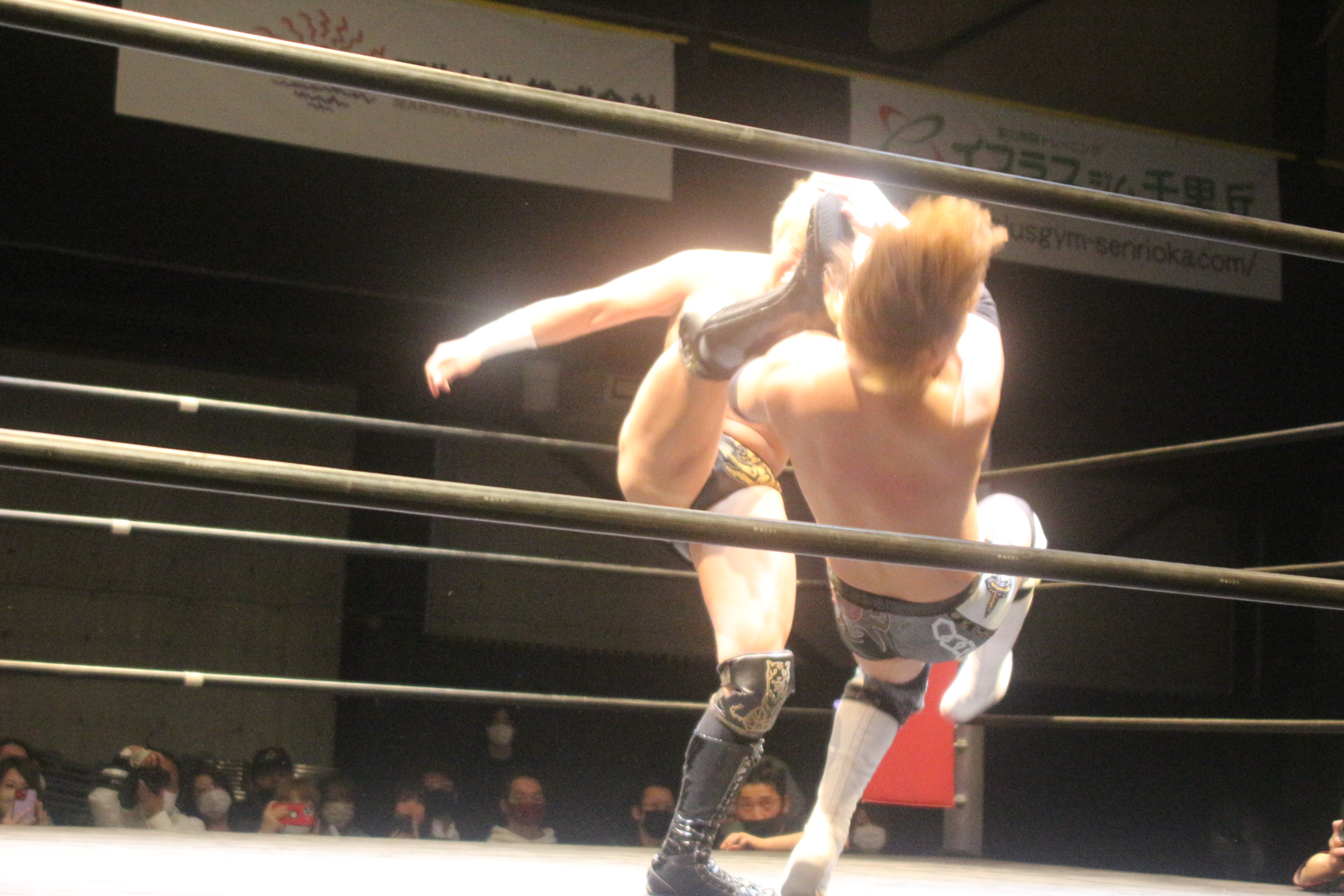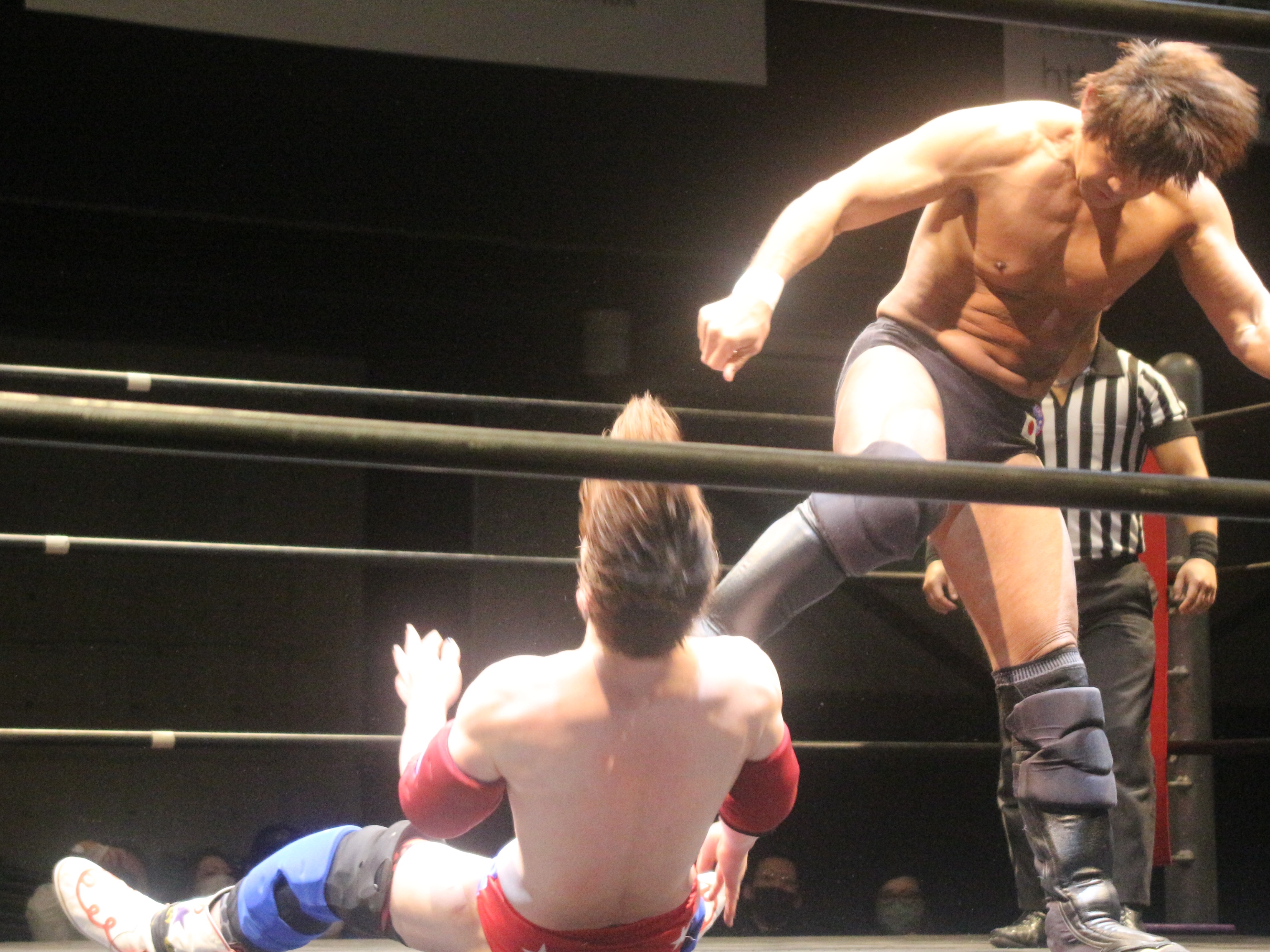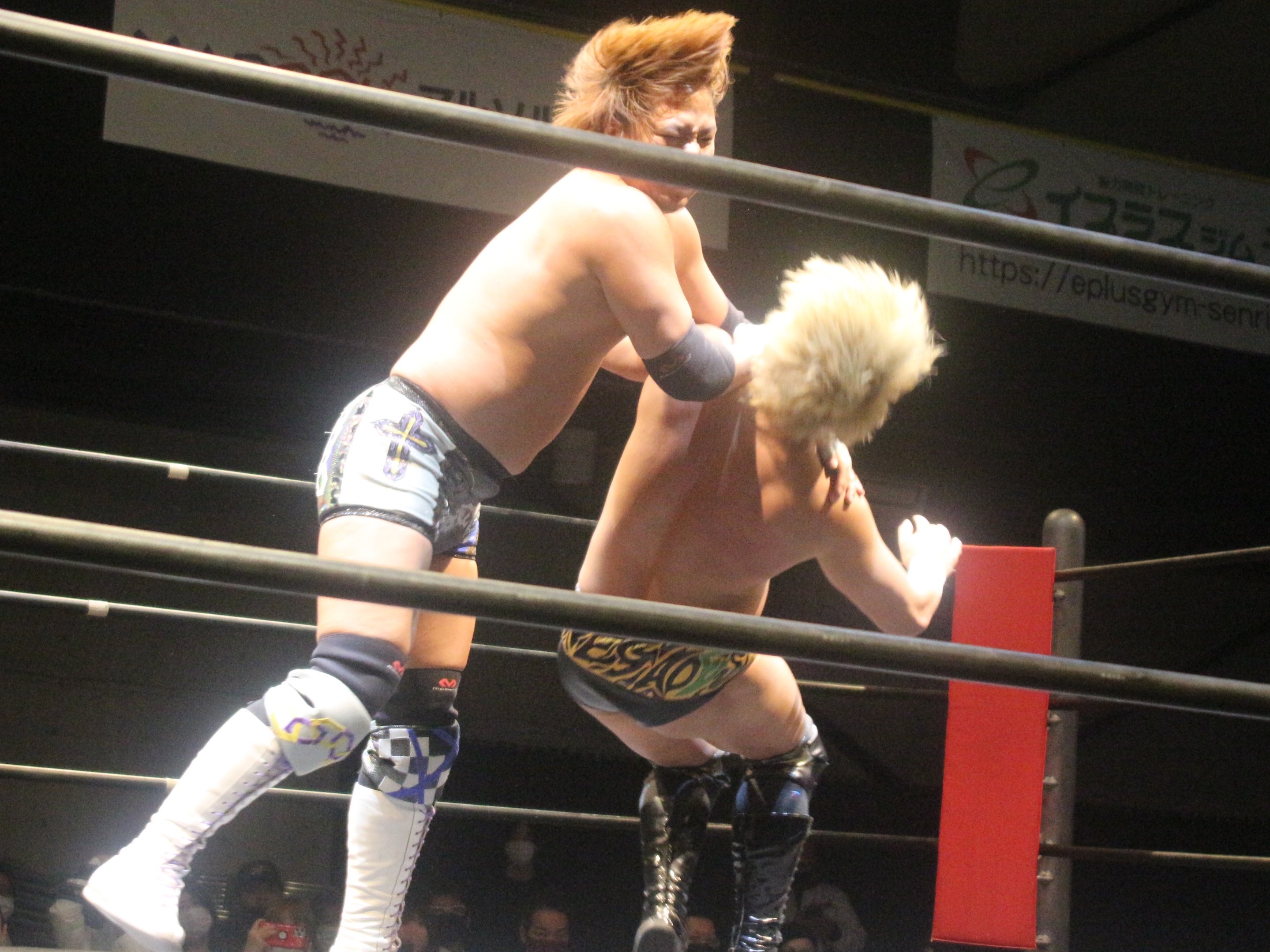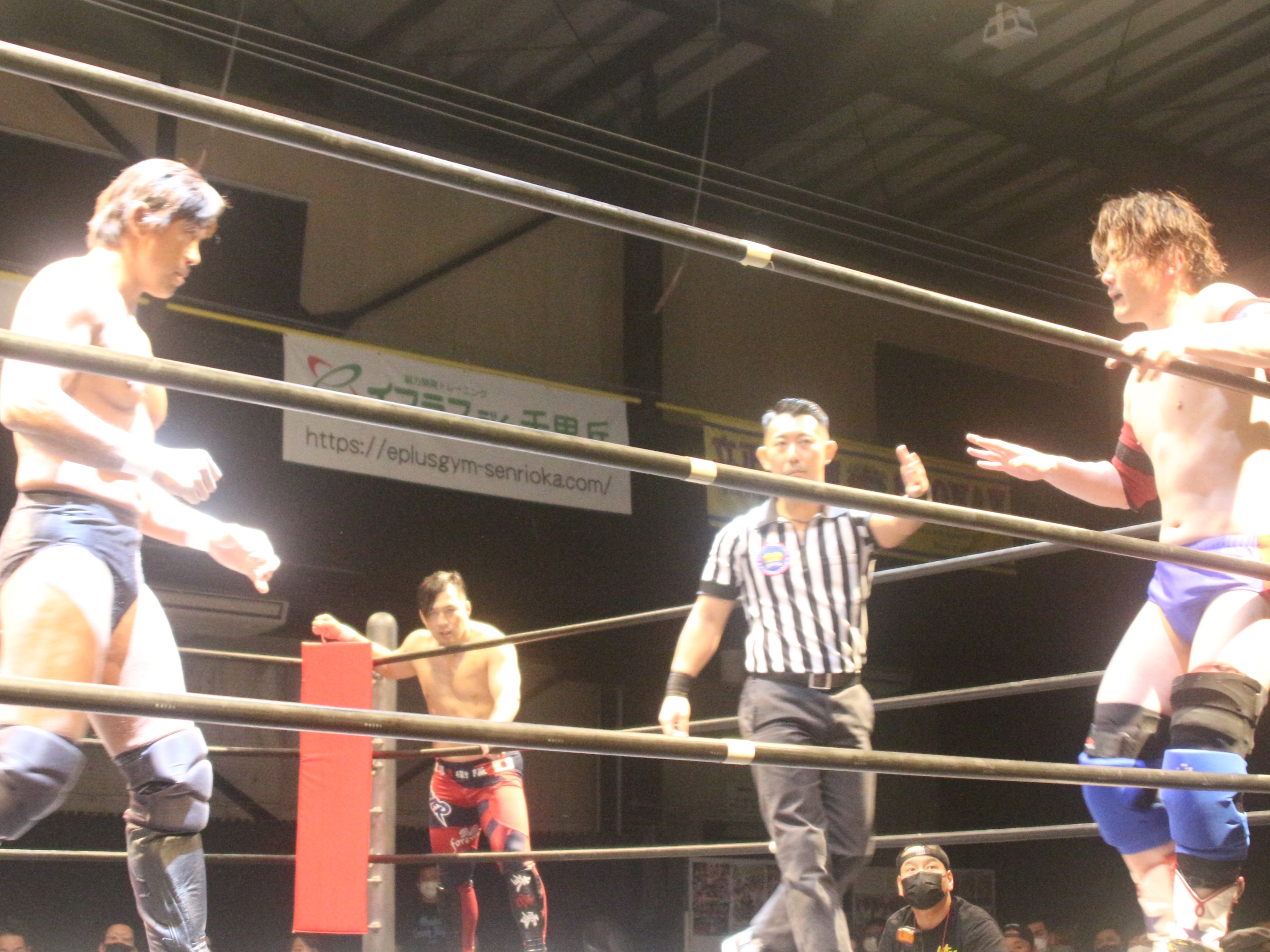正面からのサッカーボールキックのラリーになると、TORUが渡瀬の顔面にドロップキックを放ち、渡瀬もドロップキックで反撃して、場外のTORUにトペコン、TORUがリングに戻ったところでフロムトゥコーナー、串刺しフォアアームを命中させるなど攻勢に出る。
