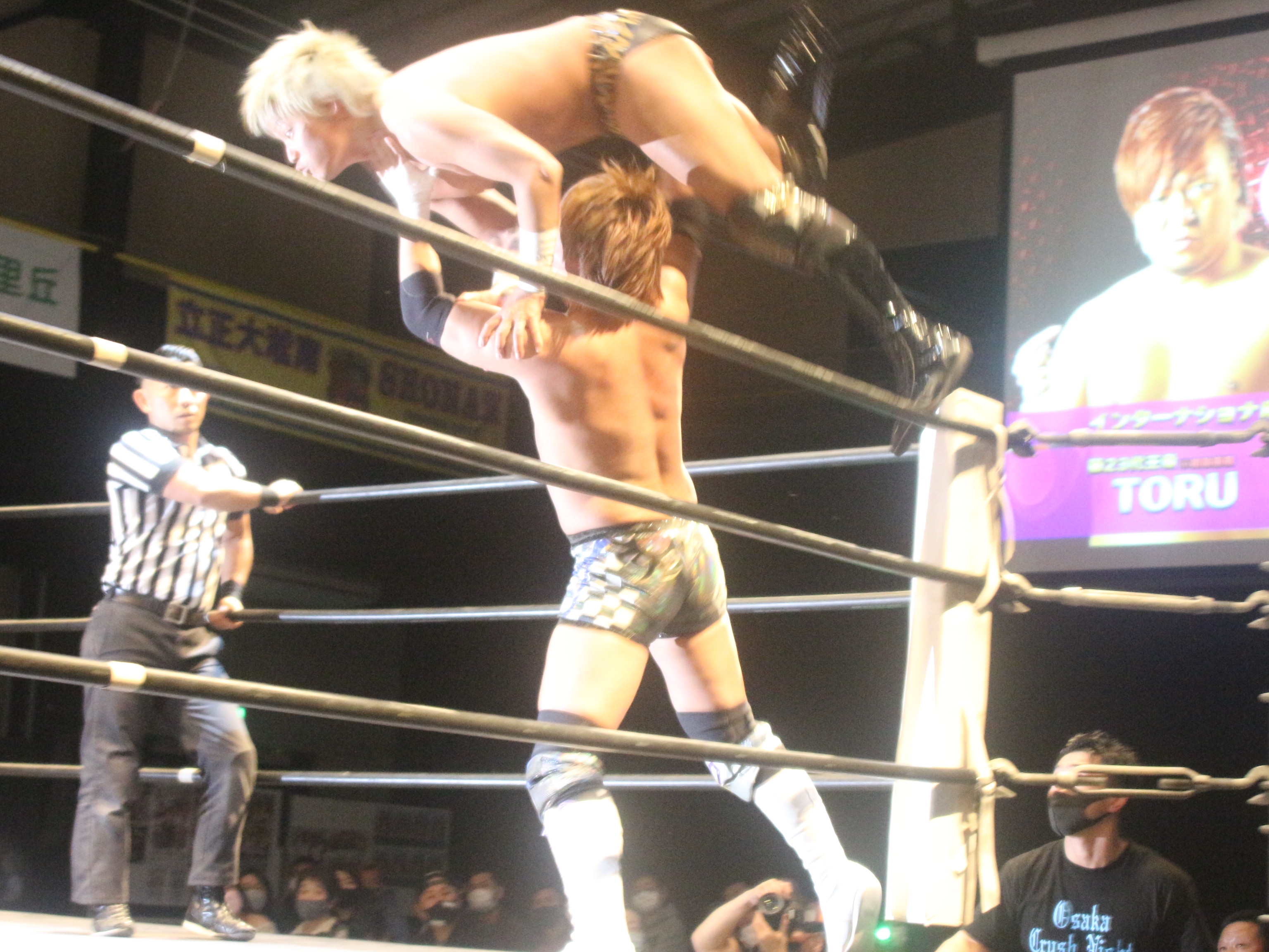 第5試合ではダブルメイン1としてインターナショナルジュニア選手権が行われ王者で新生・大阪プロレスの所属となったTORUにガンプロの渡瀬が挑戦した。