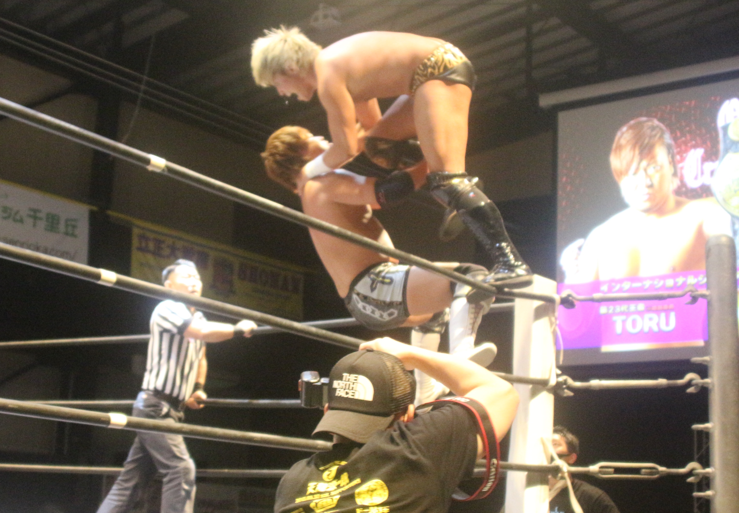 渡瀬はトップコーナーへ昇り、TORUが追いかけるが、渡瀬が頭突きでTORUの動きを止めたまま、リバース式のカーフブランディングを敢行、そしてスワンダイブを狙うと、TORUはドロップキックで迎撃、渡瀬のブレーバスター狙いをリバースフランケンで切り返し、突進する渡瀬にドロップキックを命中させる。