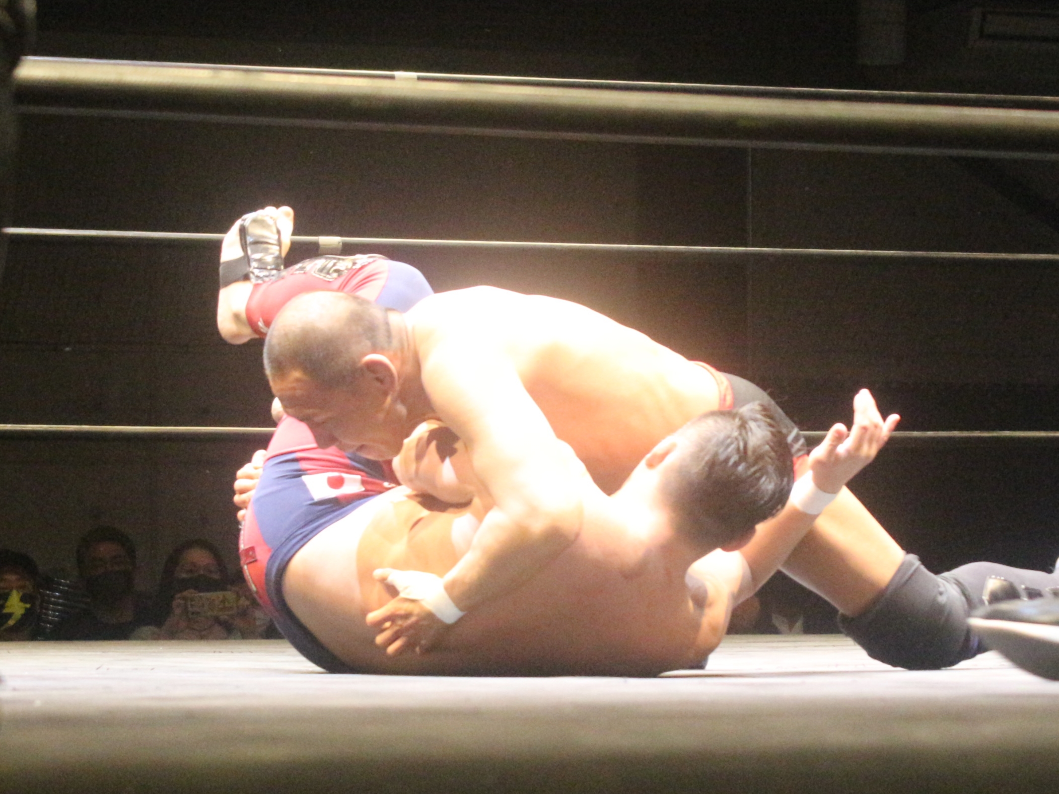 メインイベント2はインターナショナルジュニアタッグ選手権が行われ、王者の光留&矢野に船木&冨宅のパンクラスレジェンドコンビが挑戦、船木は現GHCナショナル王者で勢いに乗っているだけに後輩である光留、バトラーツ出身の矢野にしてみれば手強い相手となった。