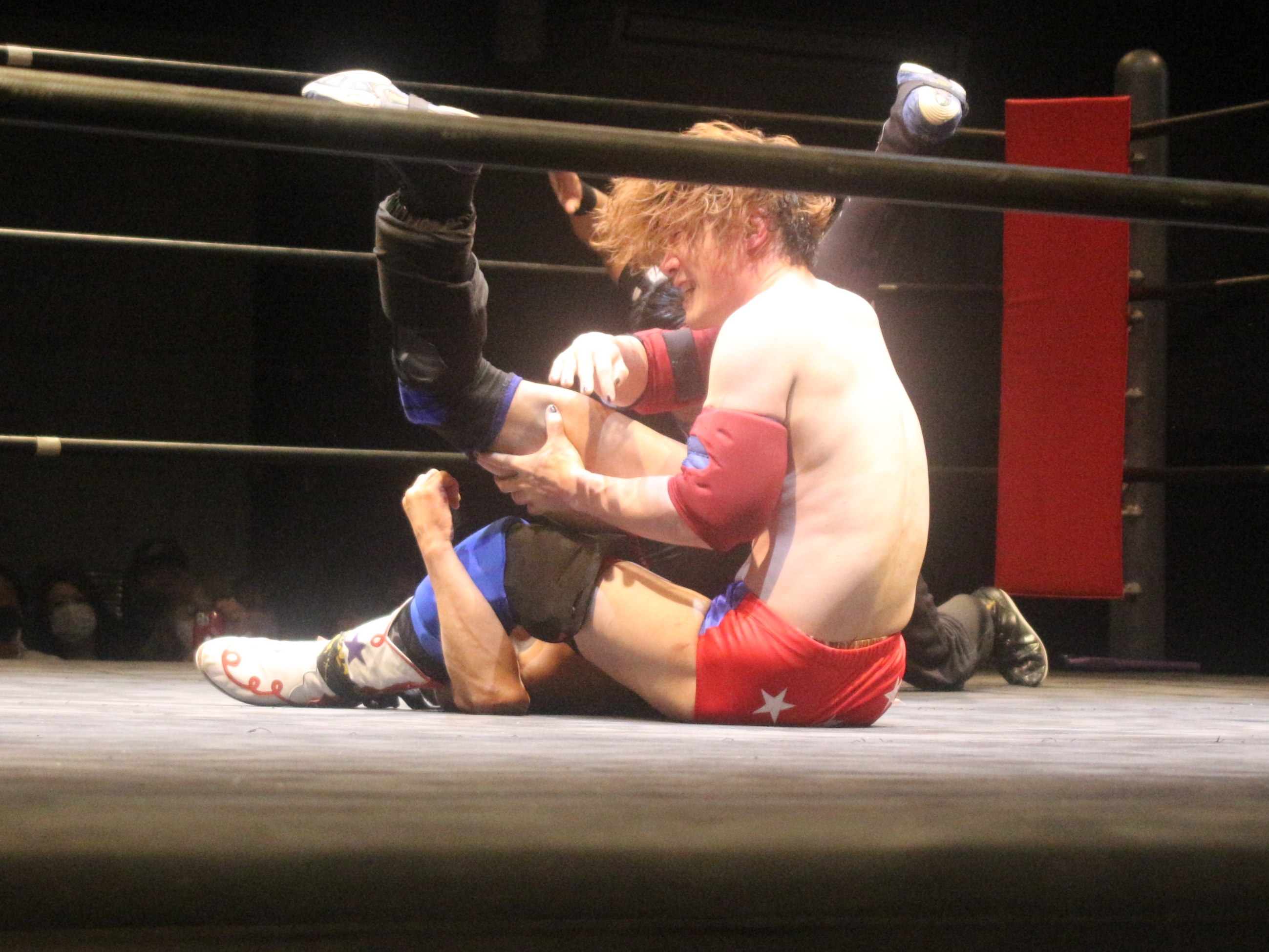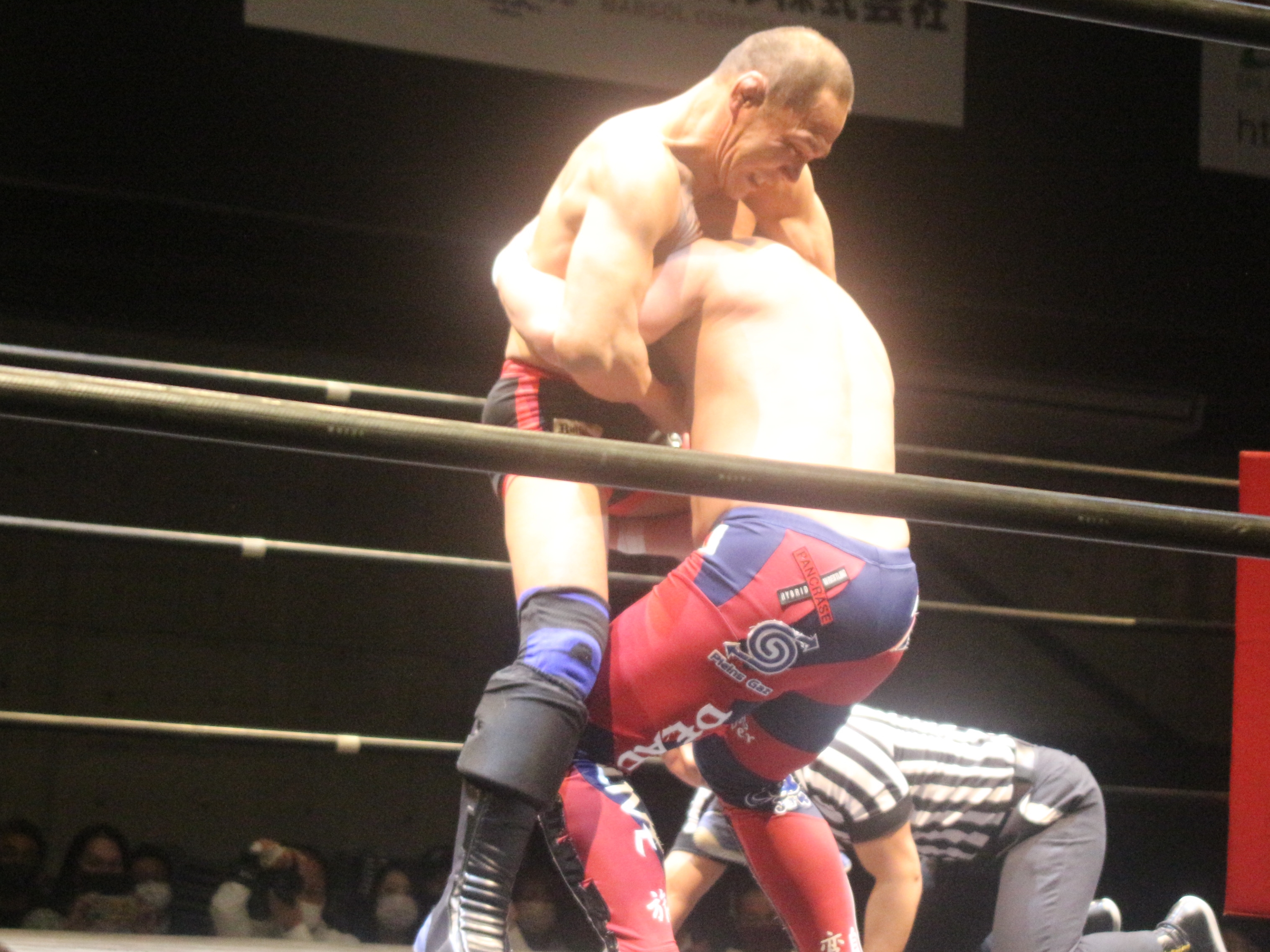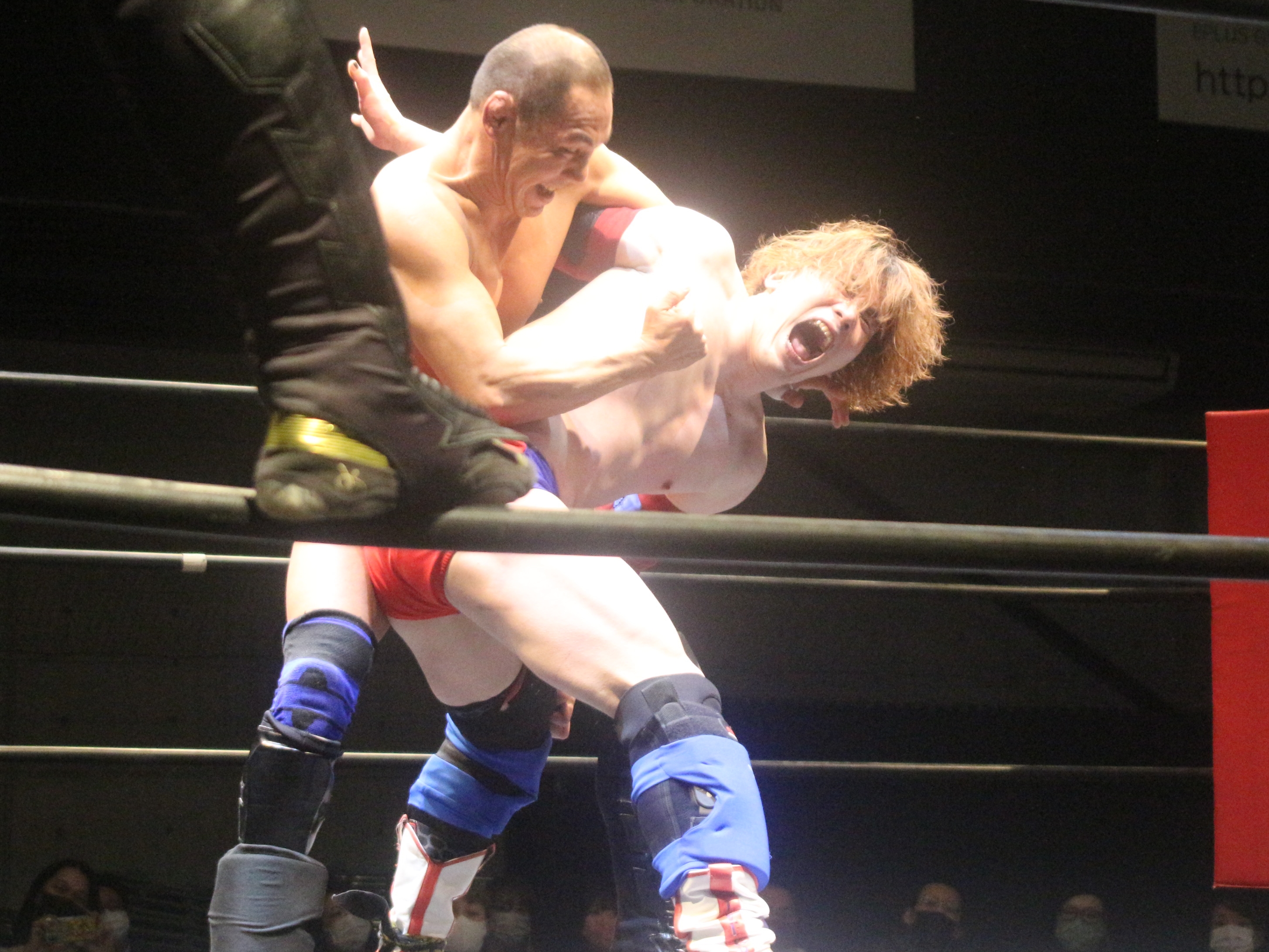 渡瀬はカーフブランディングからバックドロップを狙うが、TORUは必死で堪え、渡瀬はフロントキックを連発も、エルボーで打ち返したTORUはランニングエルボー、渡瀬はビックブーツで応戦、だがTORUはジャーマンで投げると、渡瀬もジャーマンで応戦する。