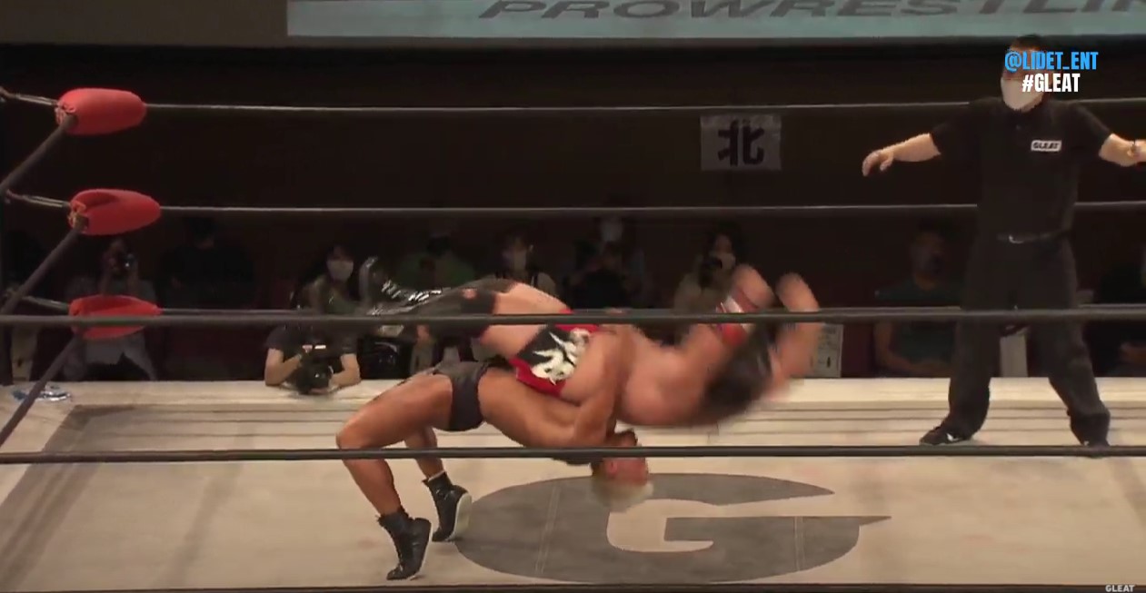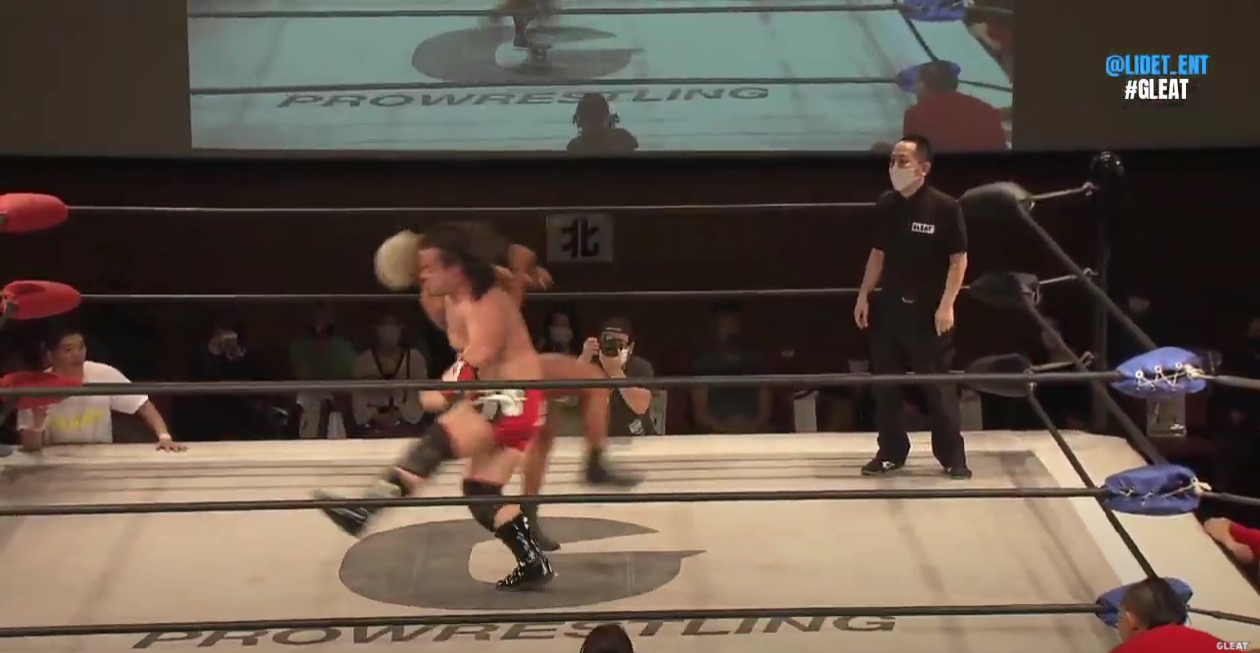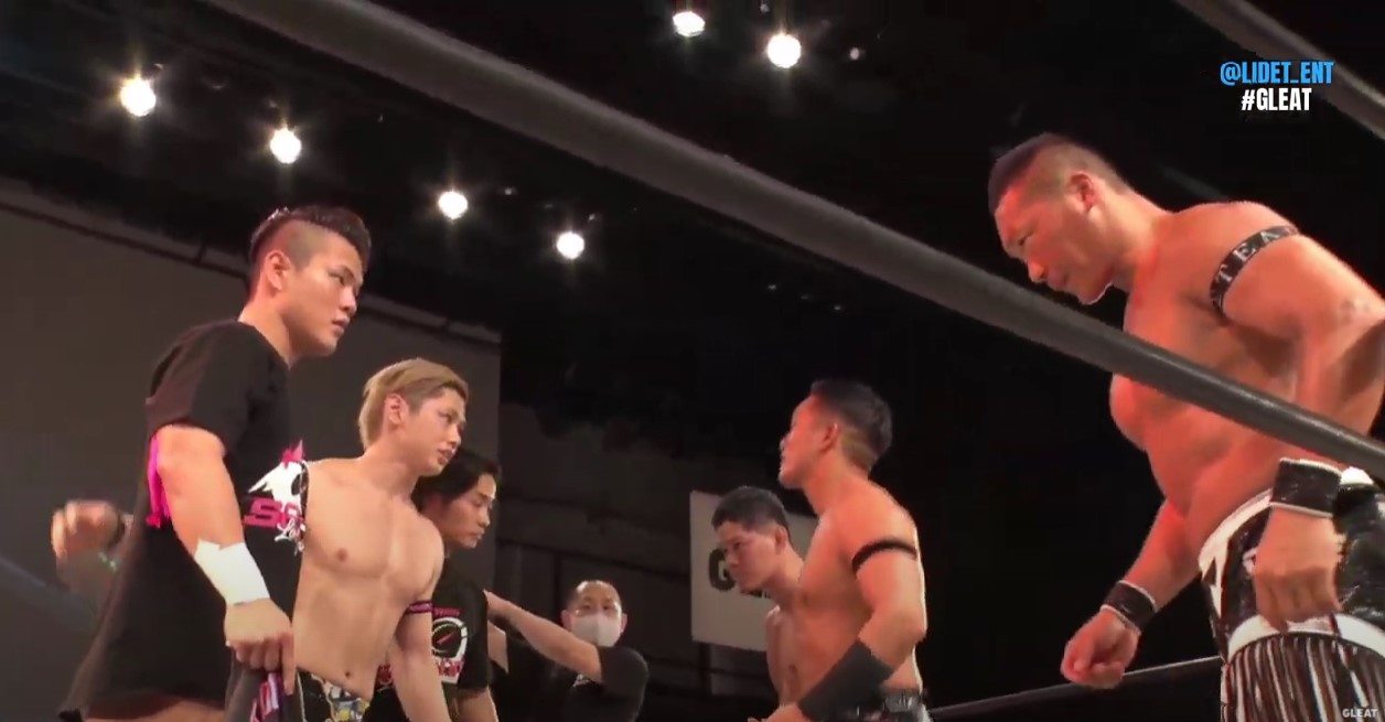 第4試合では唯一のLIDED UWFルールダブルバウトが行われ、稔が伊藤と組んで冨宅そして九州プロレスから参戦した佐々木と対戦するが、佐々木は稔とグラウンドで互角に渡り合い、スタンディングアキレス腱固めでエスケープを奪い、伊藤相手にも右足を攻めて逆片エビ固めでエスケープを奪うなどGLEAT勢を苦しめる。