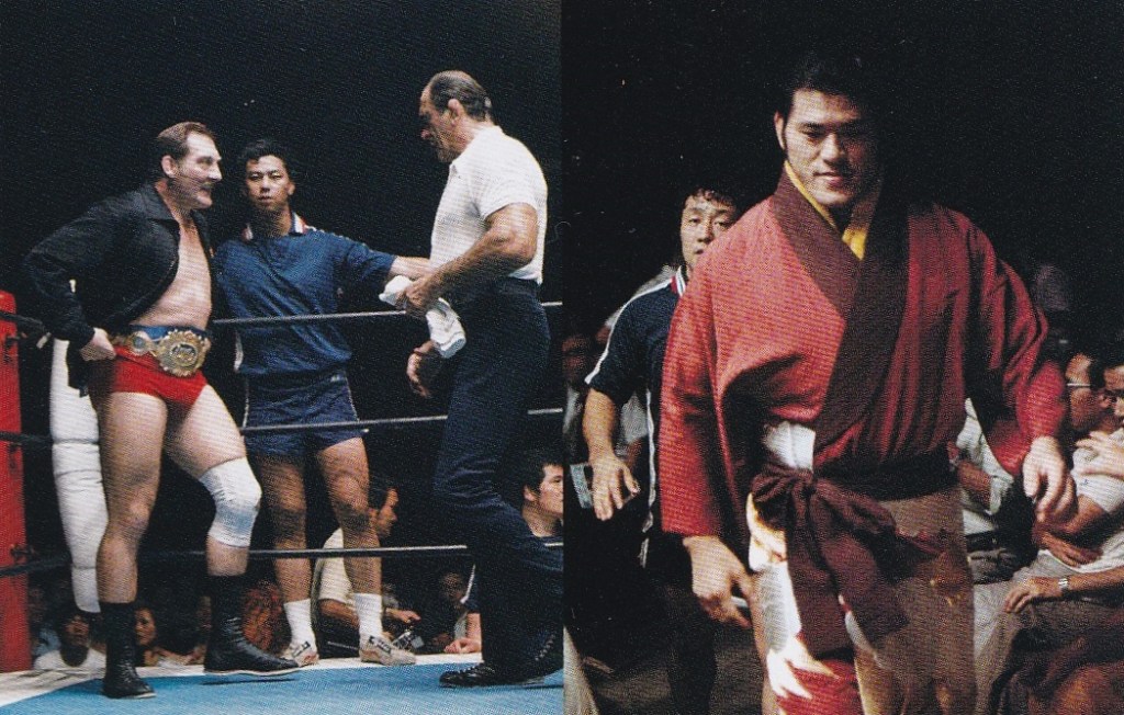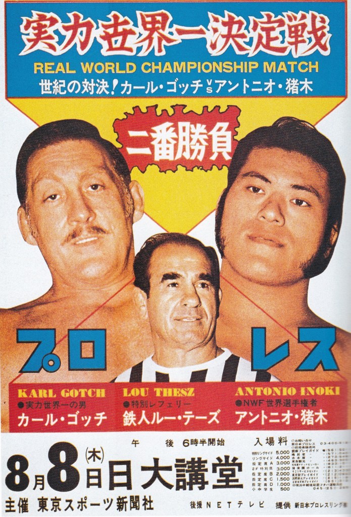 新日本プロレスは8月シリーズにはゴッチ、そしてジョニー・パワーズが参戦したが、パワーズとはNWF世界ヘビー級王座をかけて7月30日の名古屋で対戦することが決まっており、さすがにゴッチ相手ではNWFをかけるわけにはいかないということで、「実力世界一決定戦・2番勝負」とネーミングされた、ネーミングのヒントは最強タッグ戦実現に尽力した東京スポーツの桜井康雄氏が着けたものだった。
