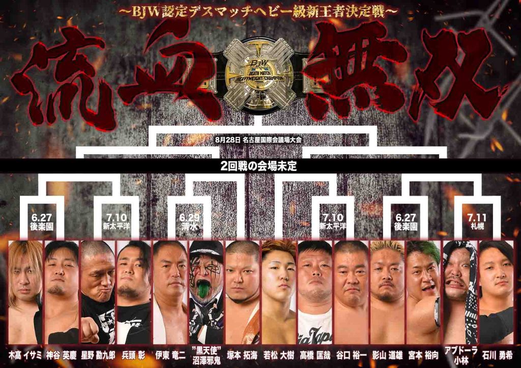 ドリュー・パーカーがフリーになり大日本プロレスを離れたことを受けてデスマッチヘビー級王座は返上し空位になったことを受けて、王座決定トーナメント「流血無双トーナメント」が開幕、14選手がエントリーしたが、参加予定だった兵頭彰が血液検査で異常数値が出てため2週間の欠場となり、それを受けて7・10新太平洋大会で対戦するはずだった星野勘九郎戦は不戦敗となり、星野は労せず2回戦に進出した。